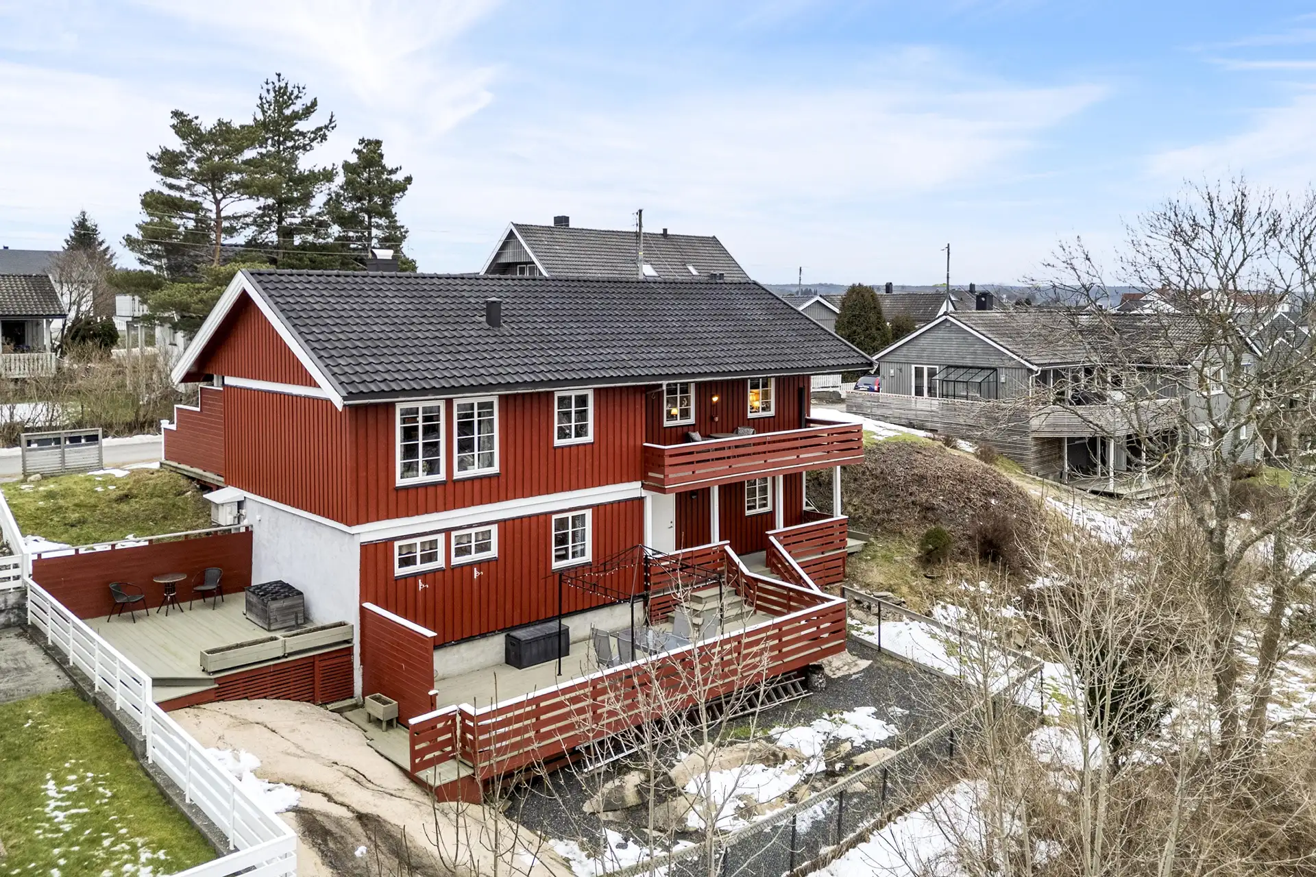 Yttervegger kledd utvendig med stående malt tre panel og saltak tekket med betong stein og takrenner i