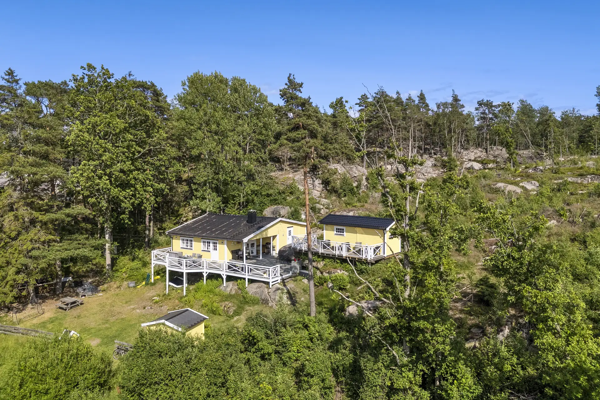 Fra stue og entre er det utgang til en terrasse på ca. 51 kvm oppsatt i trekonstruksjoner.