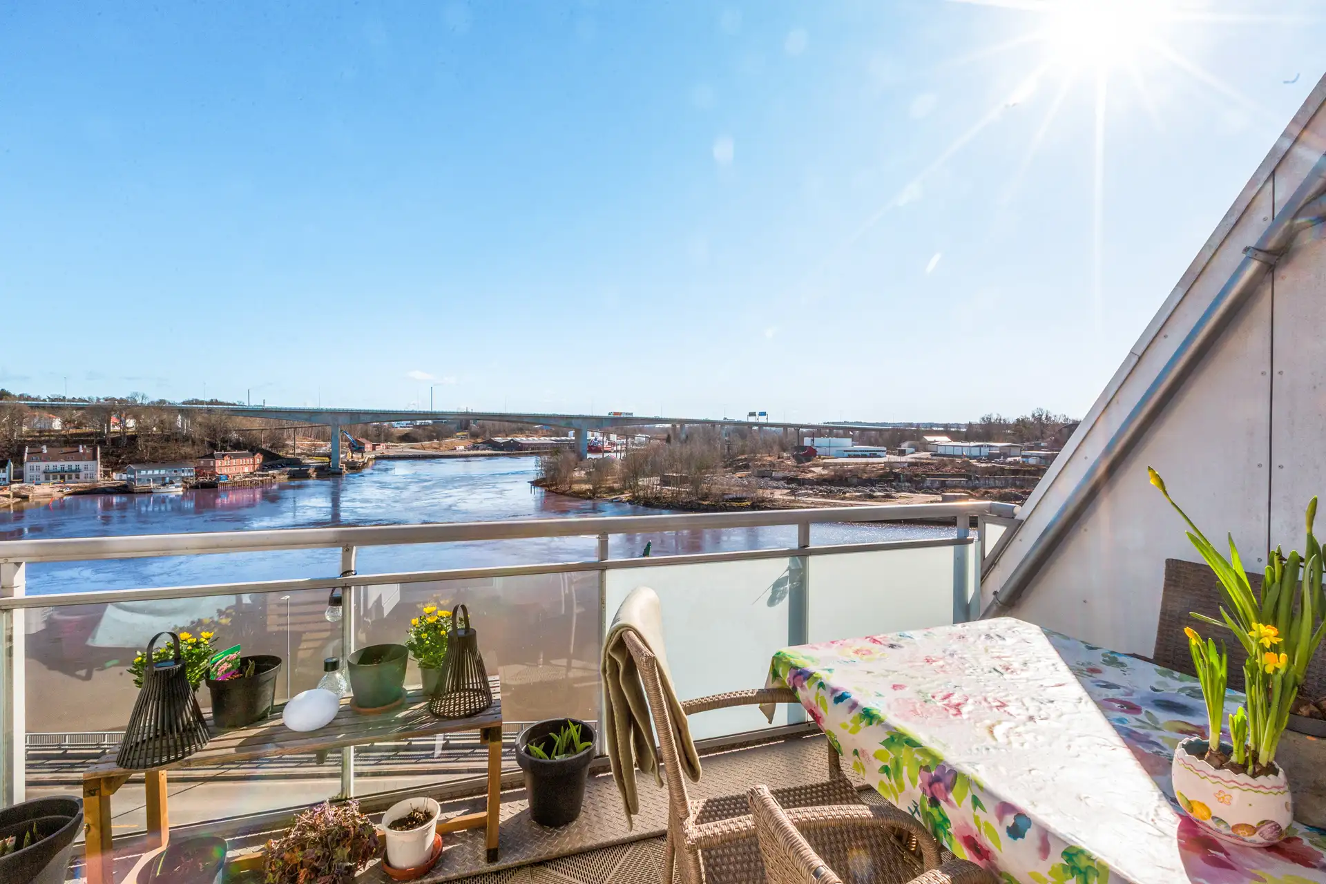 Det er utgang til en balkong mot øst fra stuen og en balkong mot vest fra soverommet. Balkongene har støpt gulv belagt med plastfliser og rekkverk i en stål- og glasskonstruksjon. Felles trapperom har støpte betongtrapper med rekkverk i stålkonstruksjon.