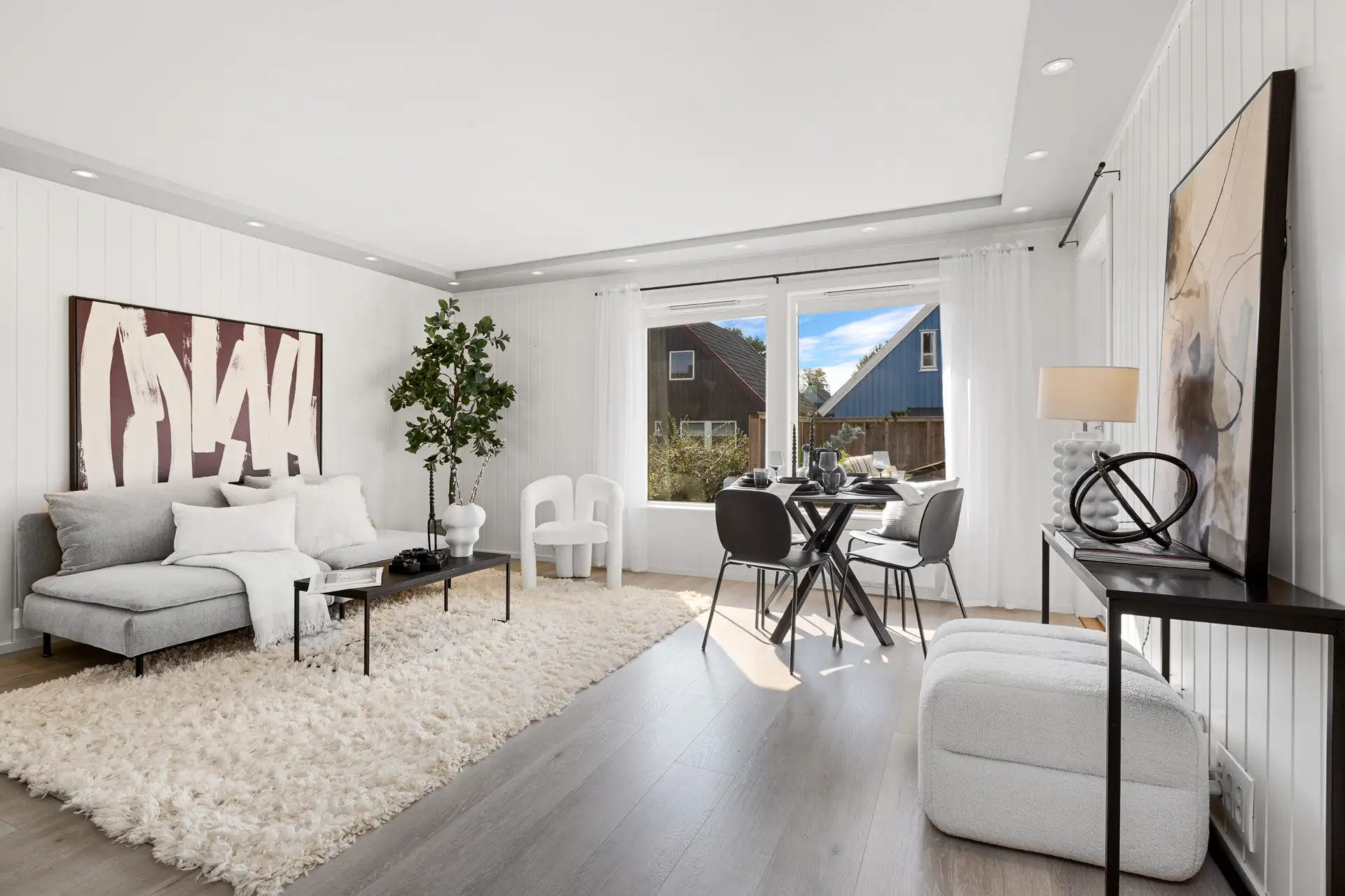 Betong dekke før yttervegger av bindingsverk kledd utvendig med stående malt tømmermanns panel.