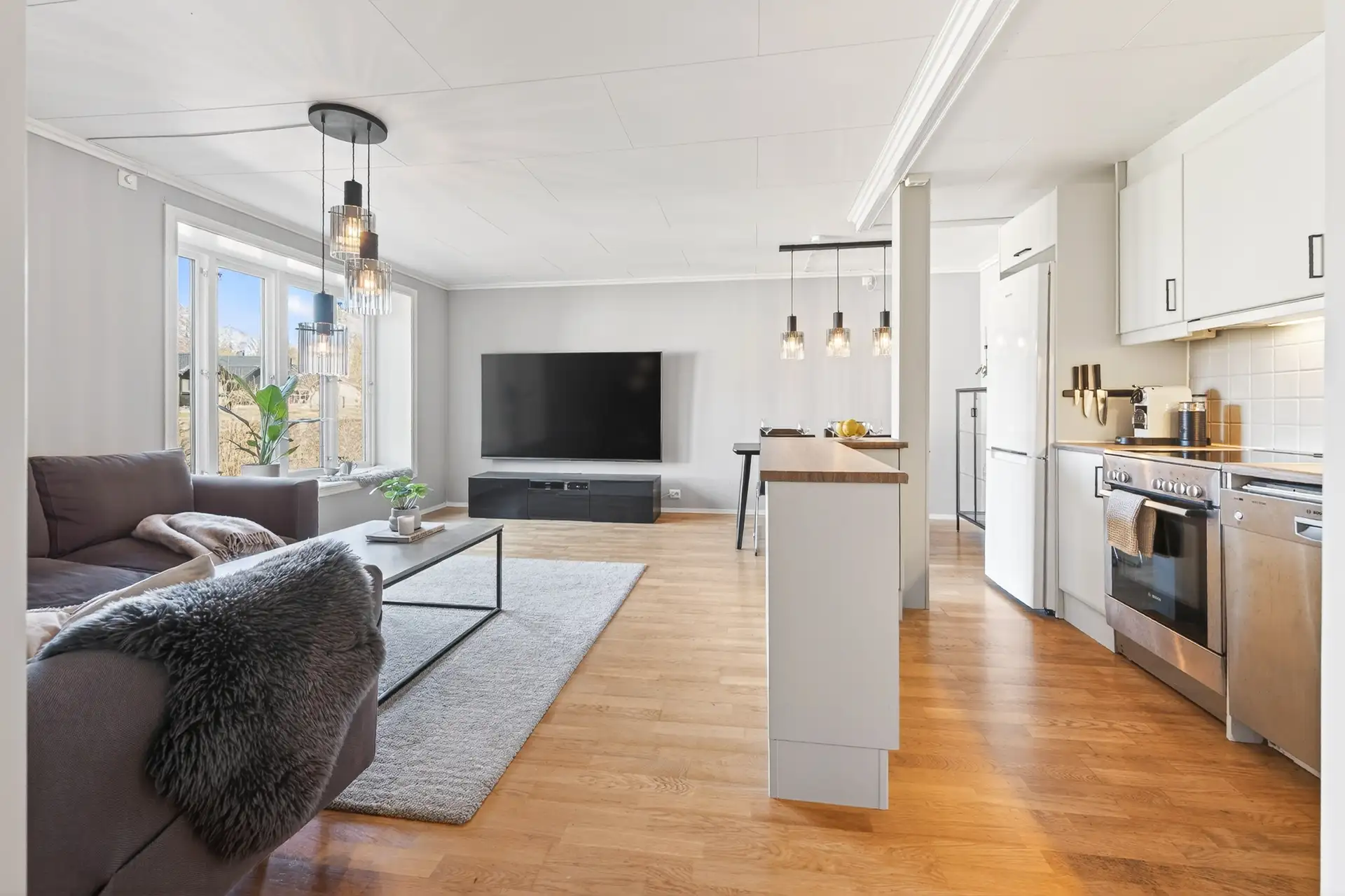 Parkettgulv. Innredning med laminerte trefiberfronter og laminert benkeplate. Tilfeldig valgte dører og skuffer ble testet, og fungerte OK. Normal bruksslitasje. Estimert brukstid ventilator er ca 15 år. Estimert levetid blandebatteri liknende er ca 15 år. Estimert brukstid oppvaskmaskin er ca 10 år. Det kan med fordel monteres komfyrvakt som stenger strøm til steketopp ved evt varmeutvikling ut over normalt. Det kan med fordel monteres lekkasjesensor med stengeventil i skap under vask samt under oppvaskmaskin. Lekkasjesensor er et krav som har kommet på nyere kjøkken. Denne boligen er bygget før kravet ble innført. I alle boliger som er bygget eller rehabilitert etter 2010 skal det være installert slik sensor/vannstopper.