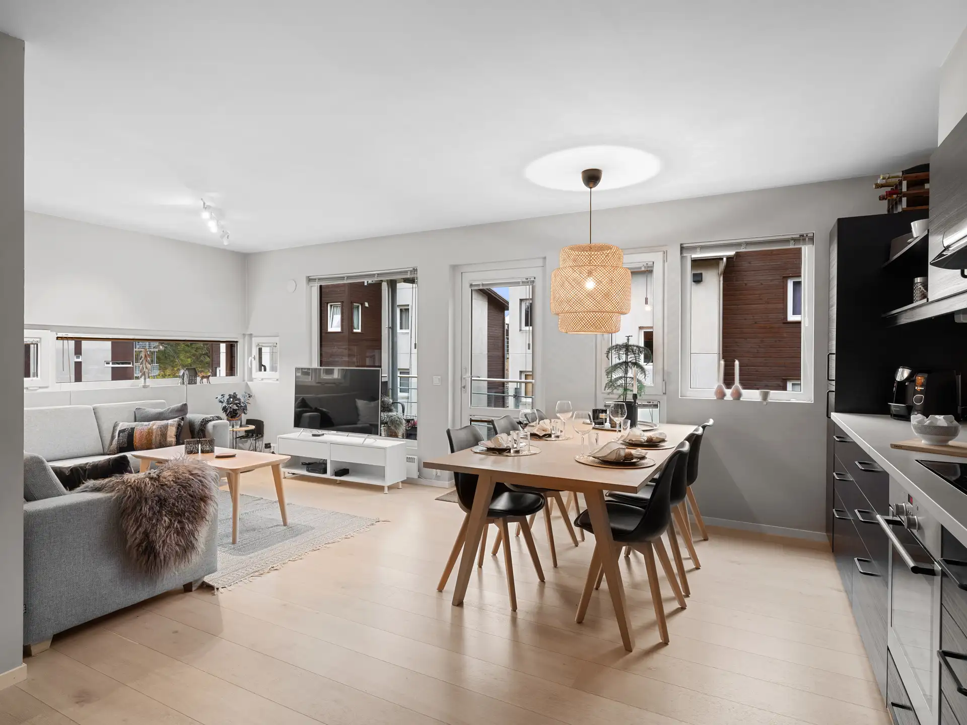 Selv med 3 soverom er det god plass til spisebord og sittegruppe | Endeplassering med 3 yttervegger med vinduer gir mye naturlig lys ( 13 av )