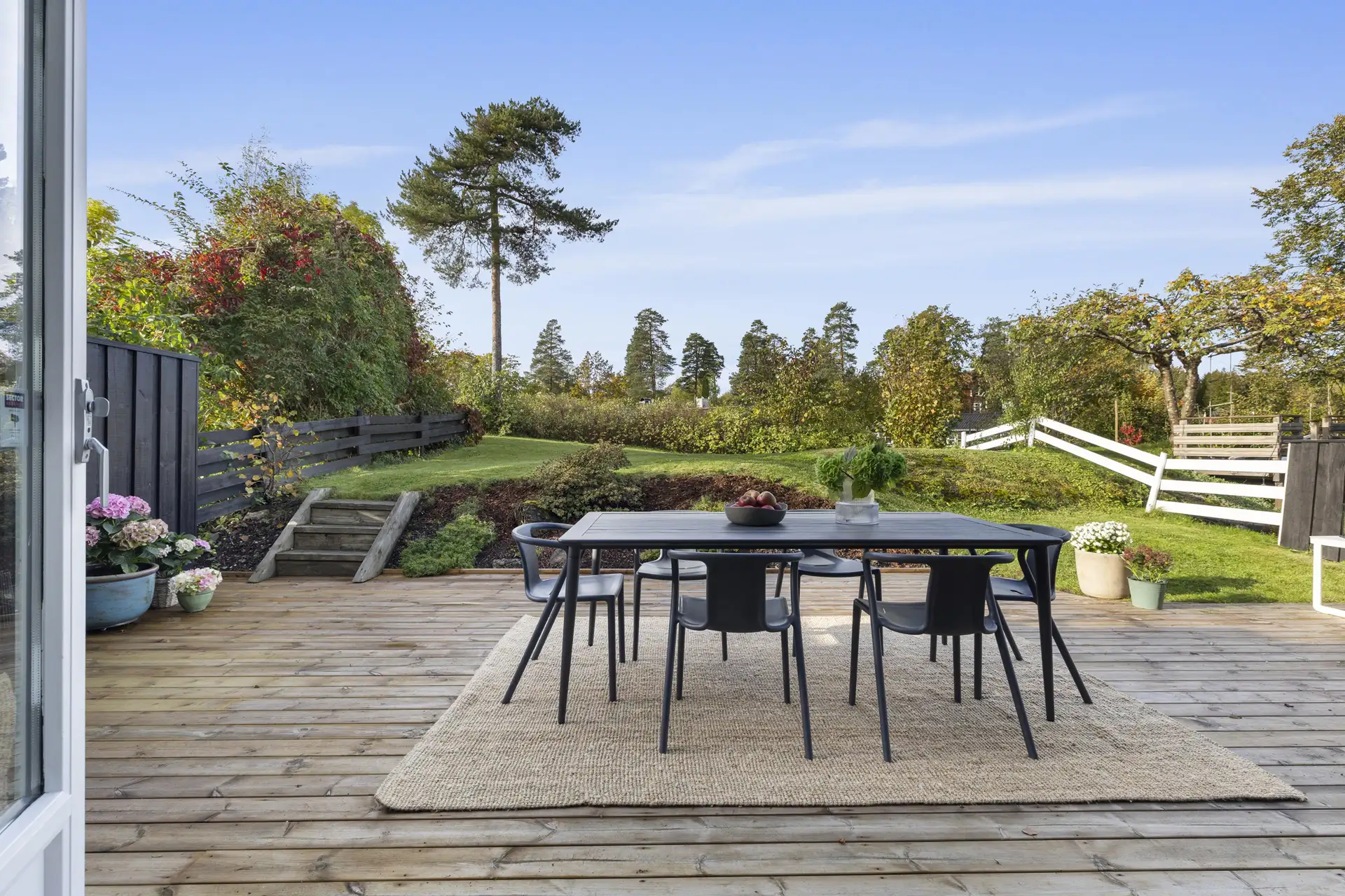Uteplassen ligger solrikt og usjenert til, med utsyn mot grønne, rolige omgivelser. Her får du et lunt og