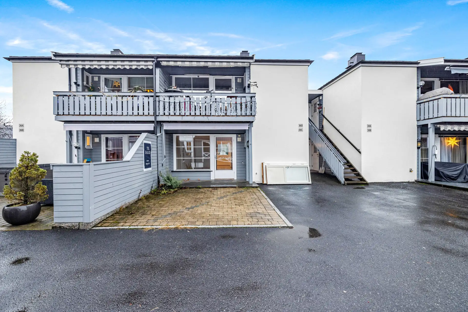 Utgang fra stue til markterrasse med tregulv(størrelse ca 6,5 m²), belegningsstein, levegg, lys og