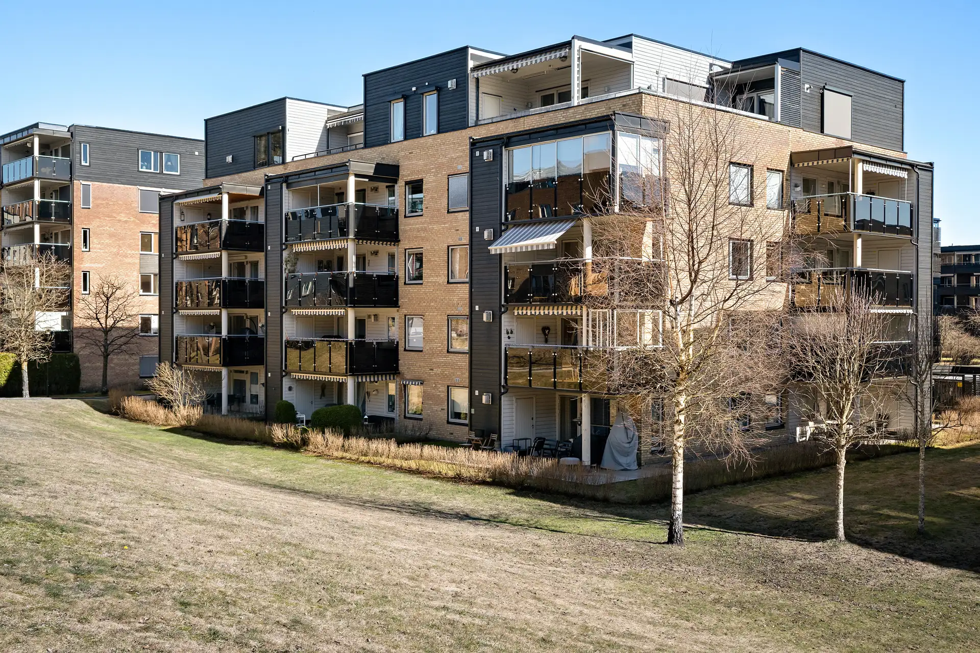 Bygningen har malte trevinduer med 2-lags glass. Malt balkongdør i tre.
