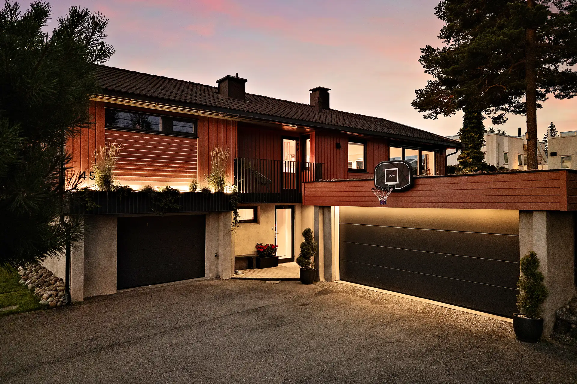 - Veggkonstruksjon: På deler av fasaden, spesielt ved terrasse mot gavlvegg, er bordkledningen avsluttet for nært terrasseplattingen.