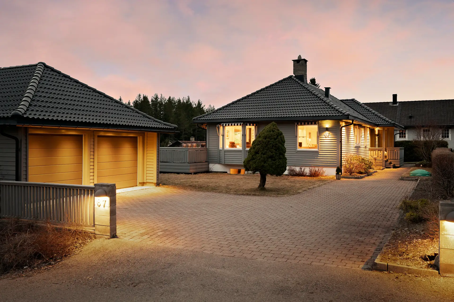 Grunnmuren er oppført i lettklinkerblokker. Det er delvis synlig grunnmursplast rundt boligen, antatt fra byggeåret. Veggkonstruksjonen består av en trekonstruksjon av ukjent utførelse, med utvendig liggende bordkledning. Det er registrert lufting og musesperre. Takkonstruksjonen har W-takstoler i tre med "kinavipp" og er luftet via gesimser. Taktekkingen består av betongtakstein. Takrenner, nedløp og beslag er utført i plastbelagt stål, og det er montert snøfanger over inngangspartiet. Etasjeskilleren mellom første etasje og underetasjen er konstruert som et trebjelkelag over et betonggulv. Bygningen har malte trevinduer med 2-lags glass, en hovedytterdør med glassfelt og en skyvebalkongdør i malt tre.