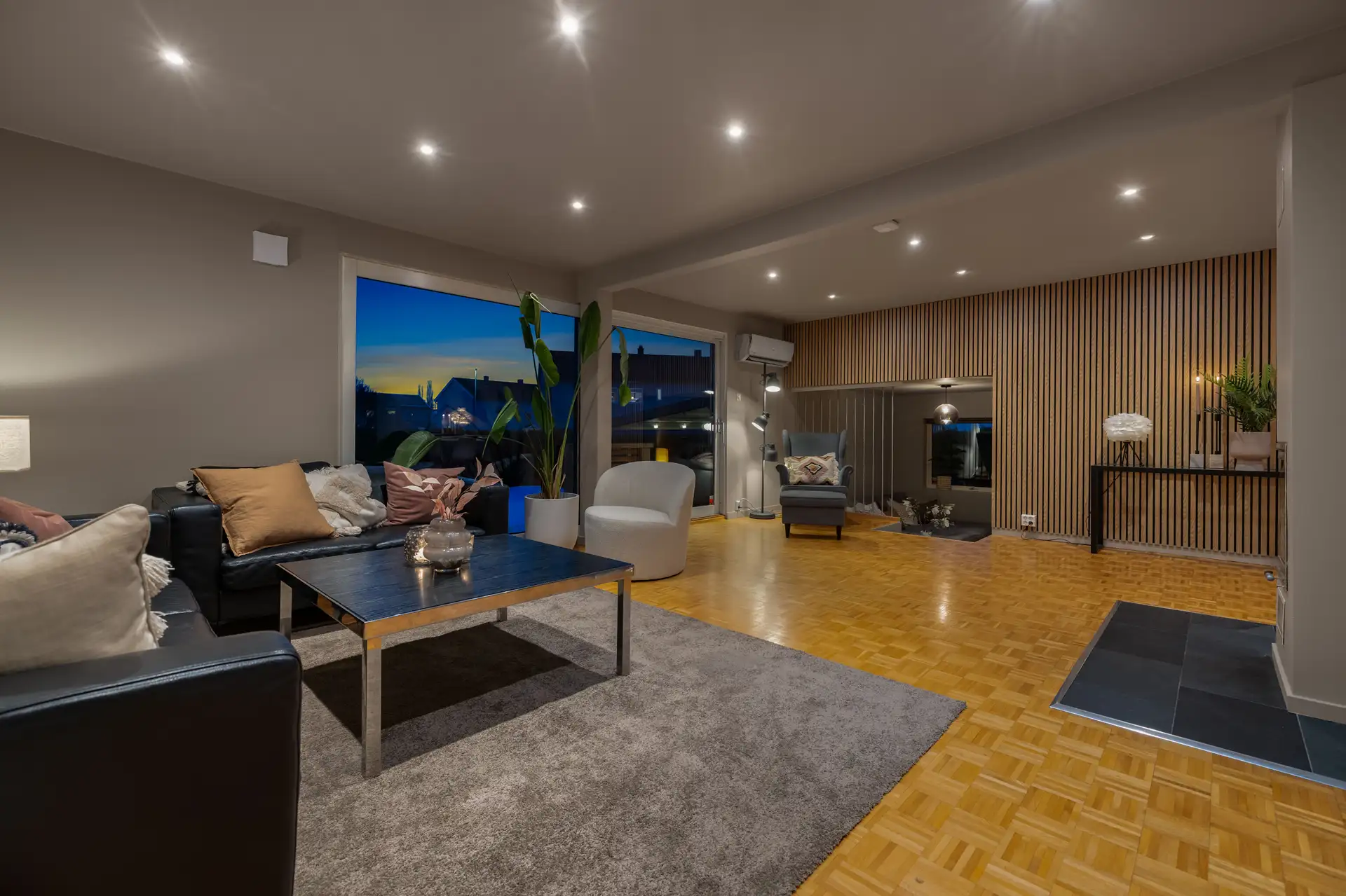 - Innvendige gulv: Det er enkelte små sprekker/glipper i parkett og eikegulv. Det er noe slitte overflater.