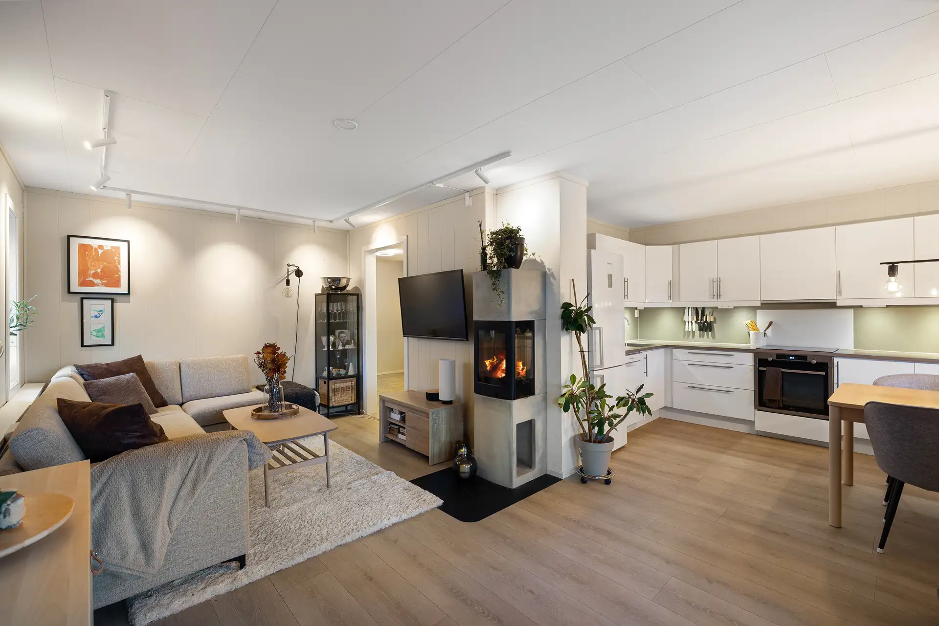 Koselig leilighet i småhus med sydvestvendt hage, terrasse og fast p-plass. Peis. Ingen dokumentavgift.