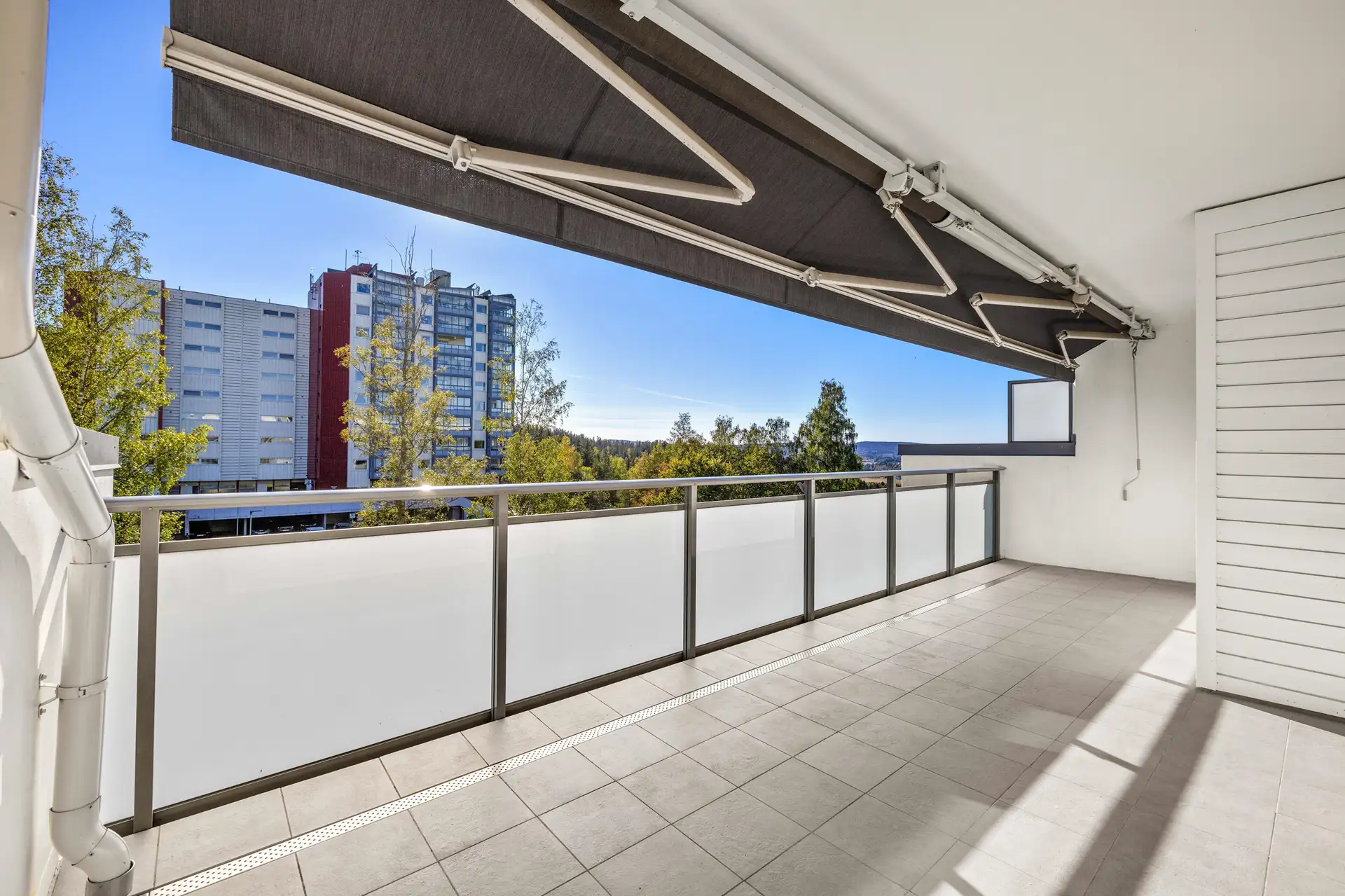 Utgang fra stue til en balkong på ca. 17 kvm. Rekkverk i stål/aluminium med innfelt glass.