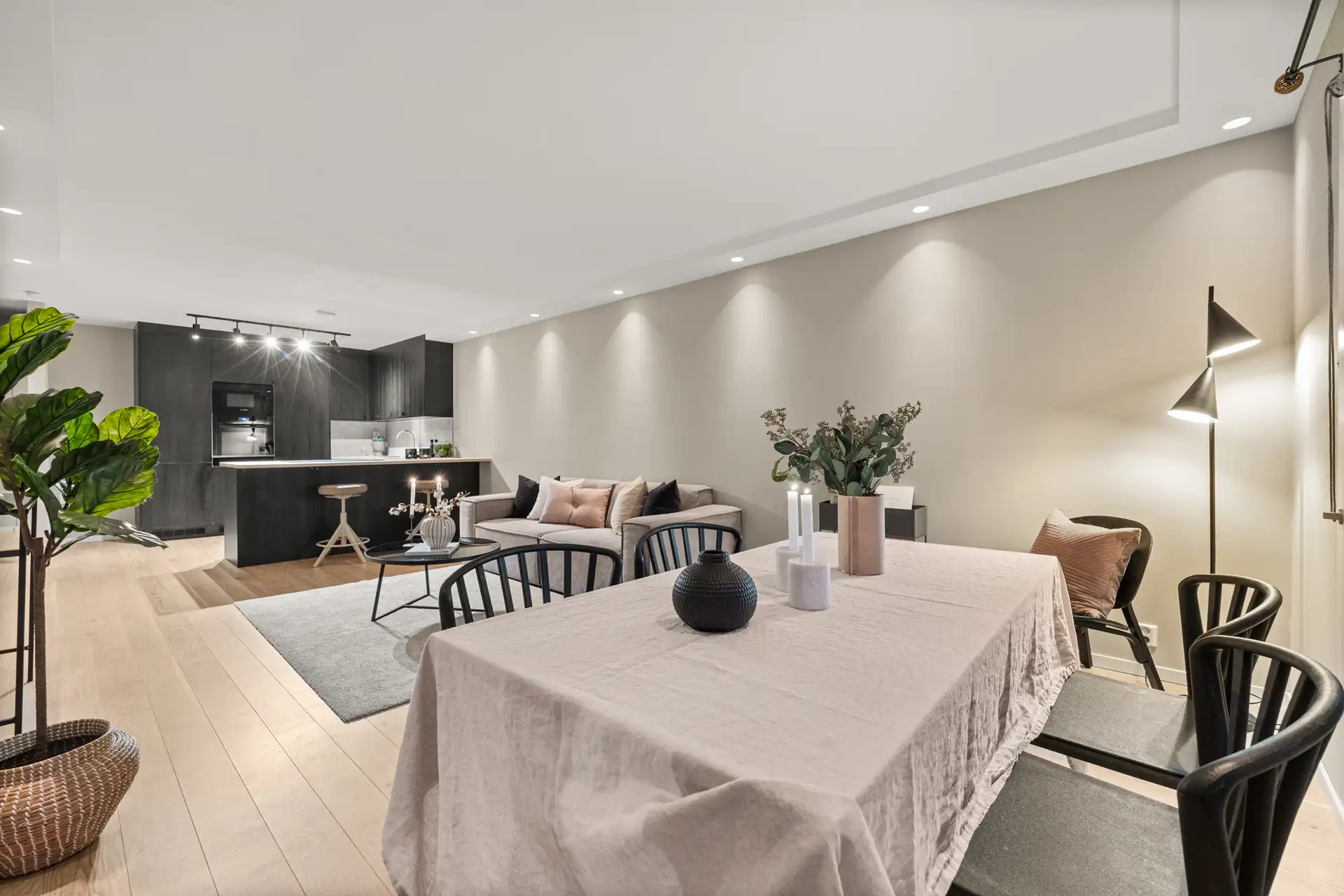 Rommet har lys enstavs parkett på gulvet og det er utstrakt bruk av downlightsbelysning i taket som kan styres via app eller bryter. ( 10 av )