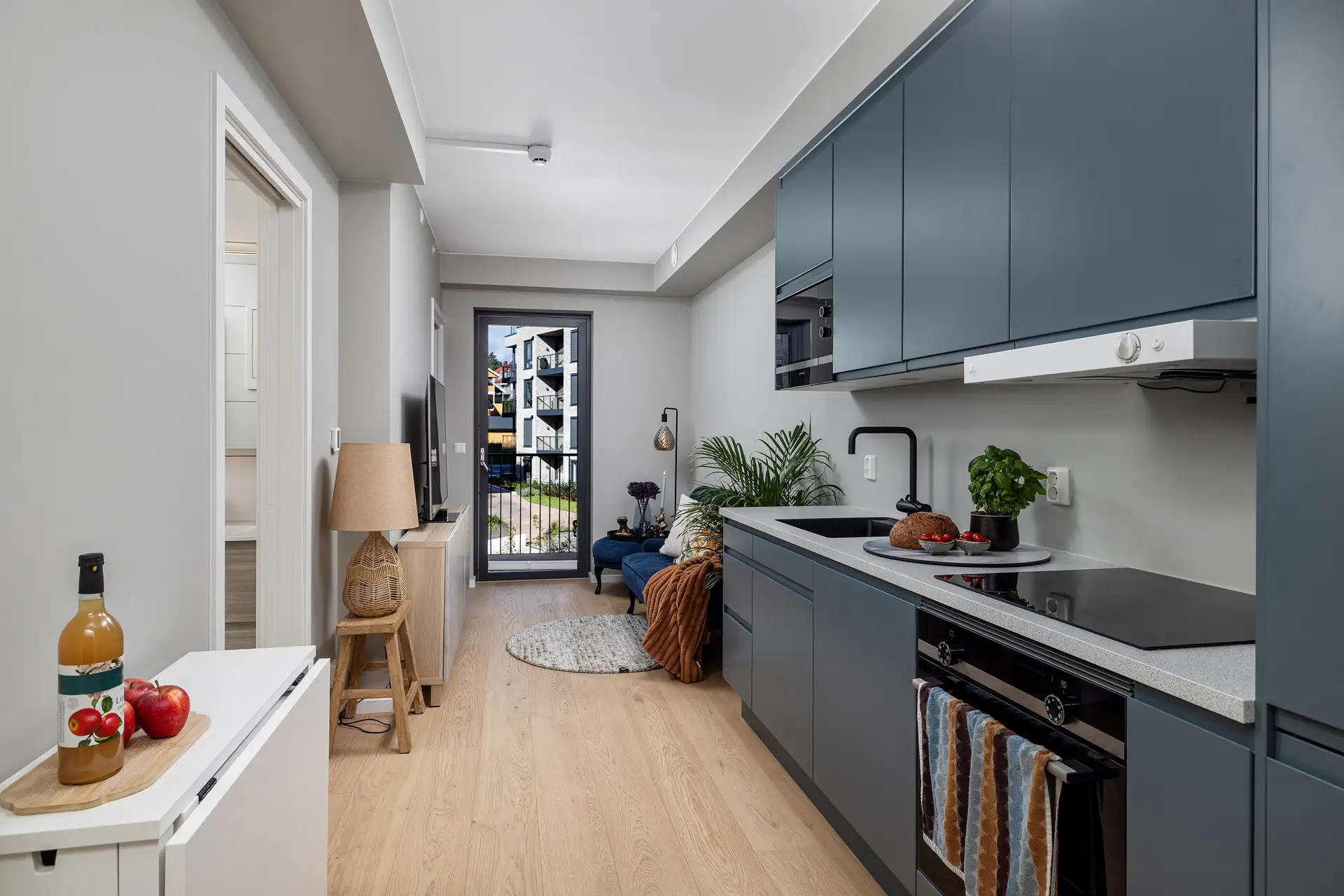 moderne kjøkken med plass til et lite spisebord, og mulighet for sofa og tv-møblement innerst. Rommet