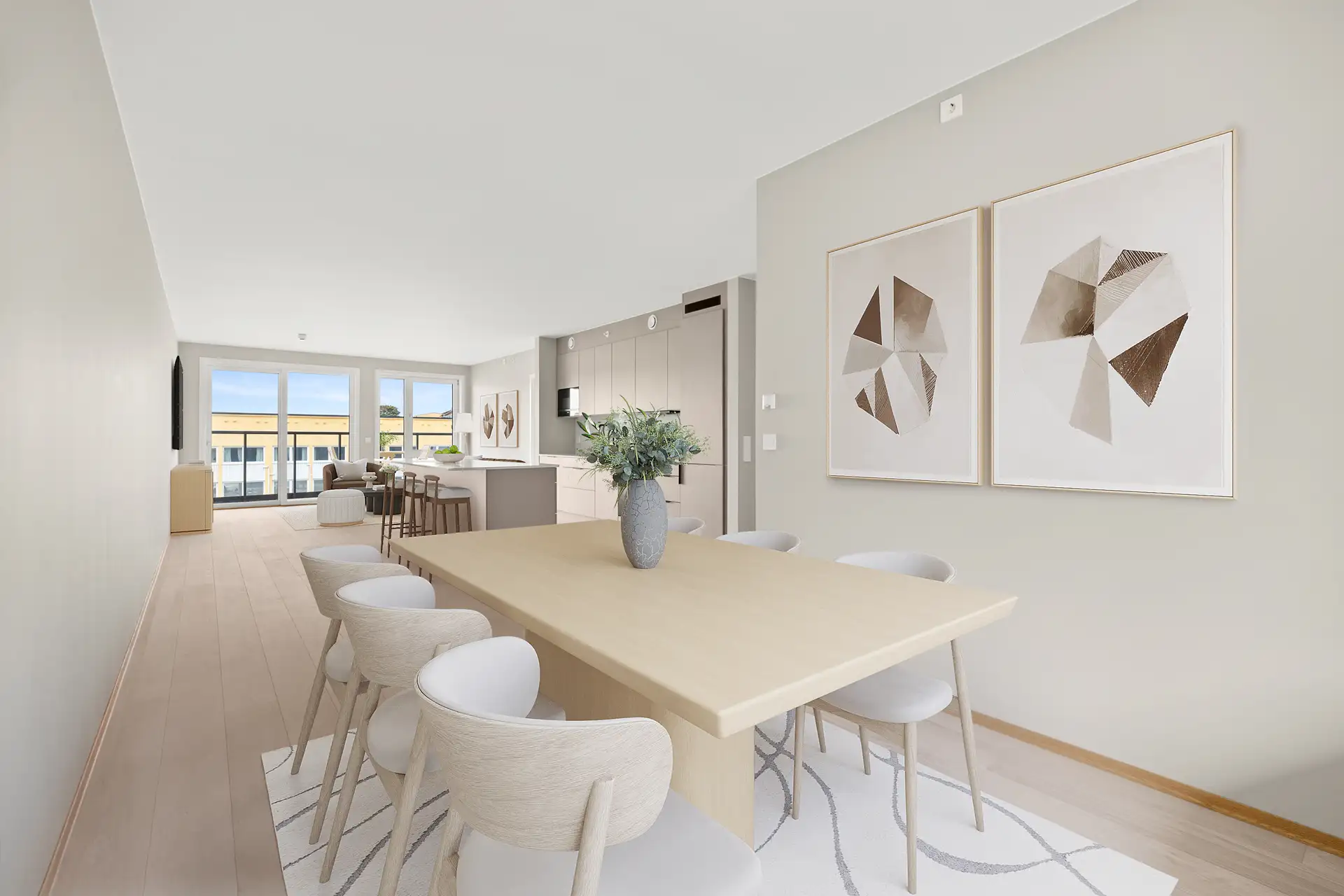 Velkommen til en strøken 3-roms leilighet på Nøsted Brygge i Drammen. Her kan man flytte rett inn i et nytt og moderne hjem med gjennomgående god standard, minimalistisk design og energivennlige finesser som balansert ventilasjon med varmegjenvinning og vannbåren varme. Oppført i 2025 etter TEK17 - 5 års garanti fra utbygger. Her trenger man heller ikke tenke på vedlikeholdskostnader i nær fremtid. Leiligheten er gjennomgående med mye lysinnslipp og stor balkong vendt mot øst med fjordutsikt. En enklere hverdag med heis opp til leilighetsplan i 4. etasje og ned til garasjekjeller hvor andelen disponerer én fast plass. Her bor du bokstavelig talt på bryggekanten, og det er kort vei til Drammen sentrum, marka med flotte turstier ved Nordbykollen og Sota badestrand.