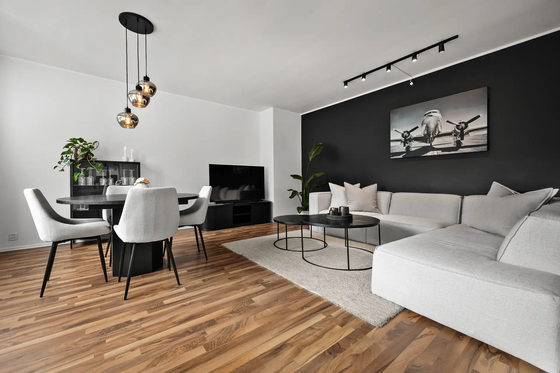 Leiligheten har god planløsning med romslig stue og spisestue og videre utgang til balkongen. Rommet vender mot naturen og har hyggelig utsyn via store vinduer, og samtidig lite innsyn. Vegger og tak er malt i hvitt, med kul kontrastvegg i sort. Laminat på gulv. Her er det god plass til sofagruppe, tv og spisebord.