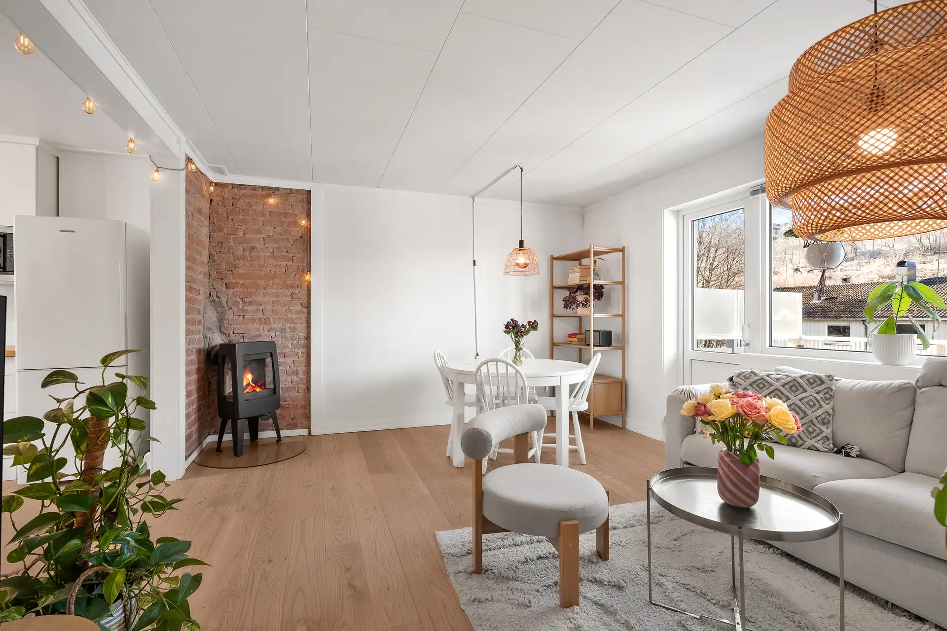 Leiligheten har et lyst og hyggelig allrom med stue, spiseplass og kjøkken i åpen løsning og samtidig i ulike soner. Det ble gjort en betydelig oppussing av overflater i denne delen i 2025/2026 med ny etter- og lydisolering av gulv, nytt parkettgulv, ny gulvvarme og nymalte overflater. Stuen er malt i hvitt og har enstavs parkettgulv, samt store vinduer mot egen balkong. I hjørnet av rommet er det peisovn (2021) og stilig teglsteinsvegg i bakkant. God plass til sofa og spisebord.