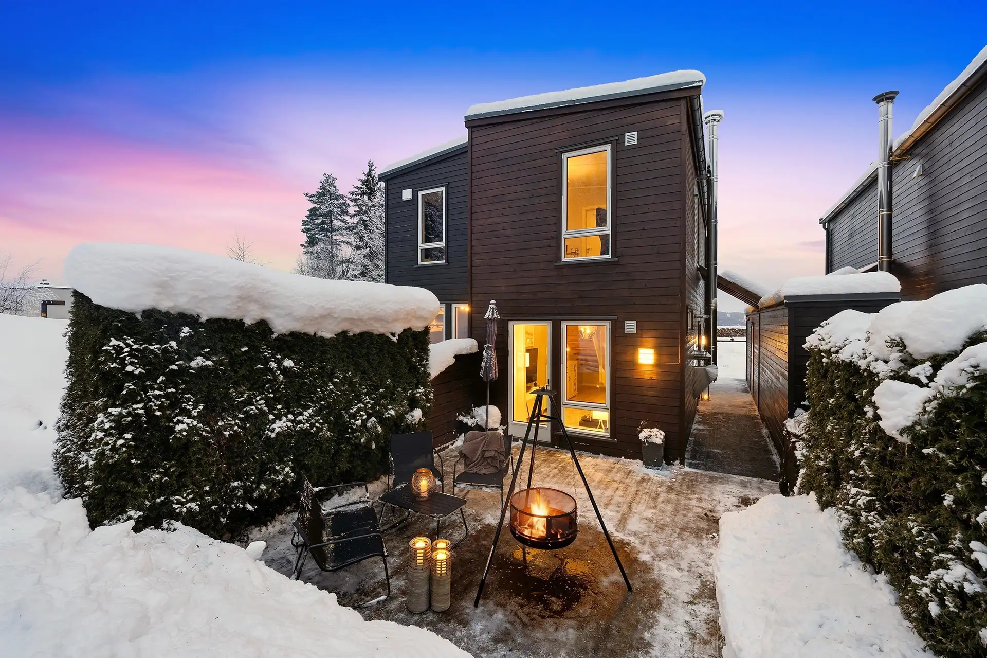 sofagruppe og TV. Utenfor stuesonen ligger en usjenert uteplass med plass til spisebord, grill og