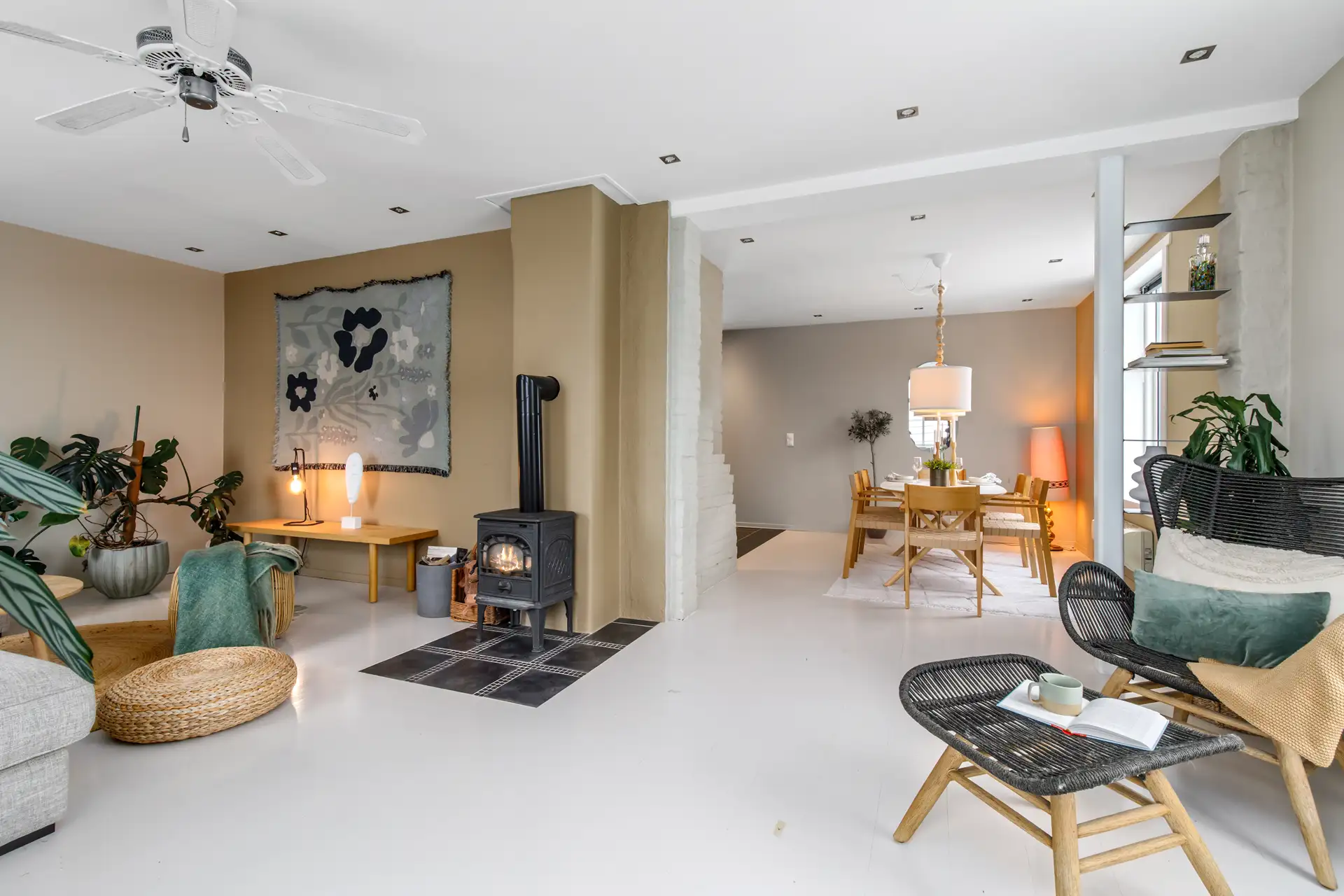 Videre inn fra entreen ligger stue, spisestue og kjøkken. Dette er et stort og innbydende samlingsted med plass til familie og gjester. Oppholdsrommet har godt lysinnslipp ed vinduer på flere sider, og flott utsikt ned mot Drammensfjorden. Rommet er malt i lun farge, har malt tak med downlights og vifte, samt malt tregulv. Sentralt i stuen er det sjarmerende peisovn som gir god oppvarming. Naturlig plass til sofagruppe med tv-møblement, og spiseplass nærmest kjøkkenet.