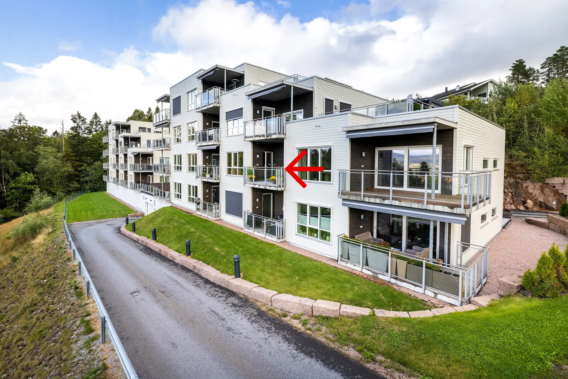 Den overbygde balkongen har adkomst via stue/kjøkken, og blir en fin utvidelse av innerommet. Flott beliggenhet mot sydvest som gir masse sol. Frontplasseringen gir også en meget flott utsikt mot Drammen og grønne åser alle veier. Balkongen måler ca. 8 kvm, har plastheller på gulvet og rekkverk i metall og glass som ikke hindrer lysinnslipp eller utsyn. Utelampe og stikk er montert.