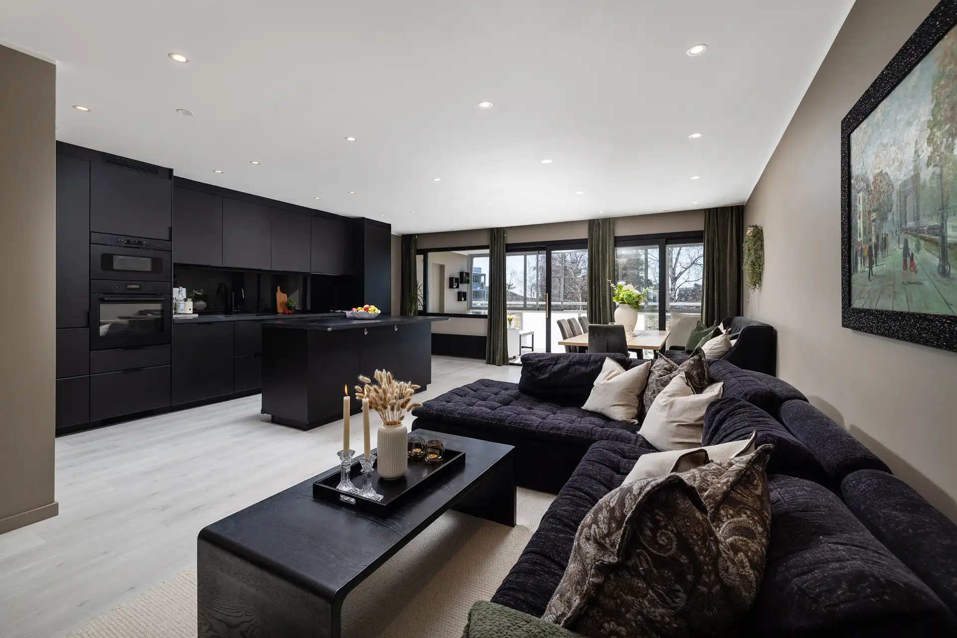 Mot stuen er det et råfint kjøkken i samme modere stil som resten av leiligheten. Kjøkkenet ble pusset opp i 2022 og har Ikea innredning med sorte, slette fronter med håndtak i samme farge, laminat benkeplate og nedfelt oppvaskkum med ettgreps kran. Praktisk kjøkkenøy gir ekstra lagringsplass, benkeflate og mulighet for spiseplass hvis ønskelig. Godt utstyrt med integrerte hvitevarer som medfølger – mikro og stekeovn i hendig høyde, oppvaskmaskin, platetopp og kombinert kjøl- og fryseskap. Ventilator med kullfilter.