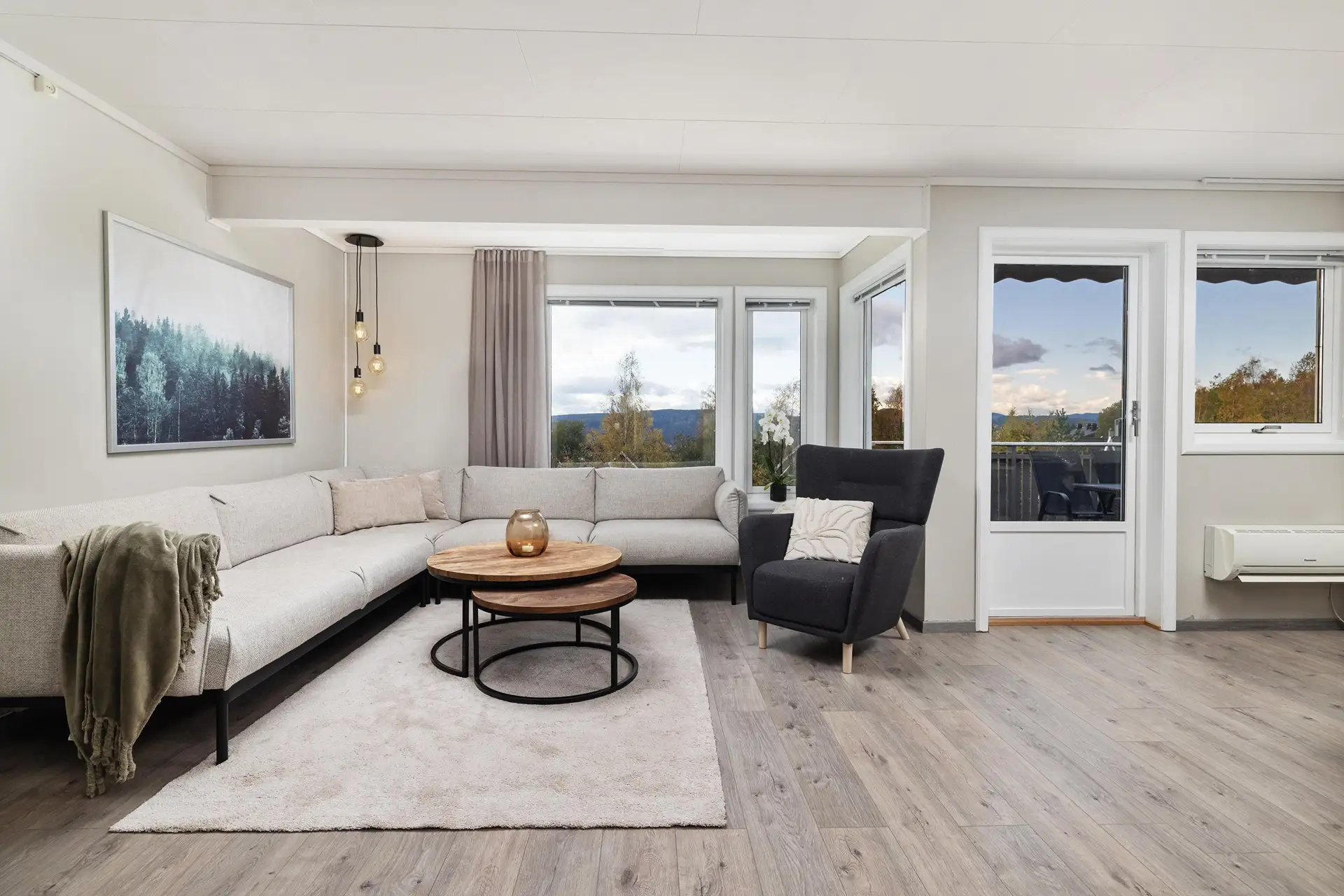 slette overflater, laminatgulv og det er rikelig med lysinnslipp fra vinduene. Nydelig utsikt retning vest og