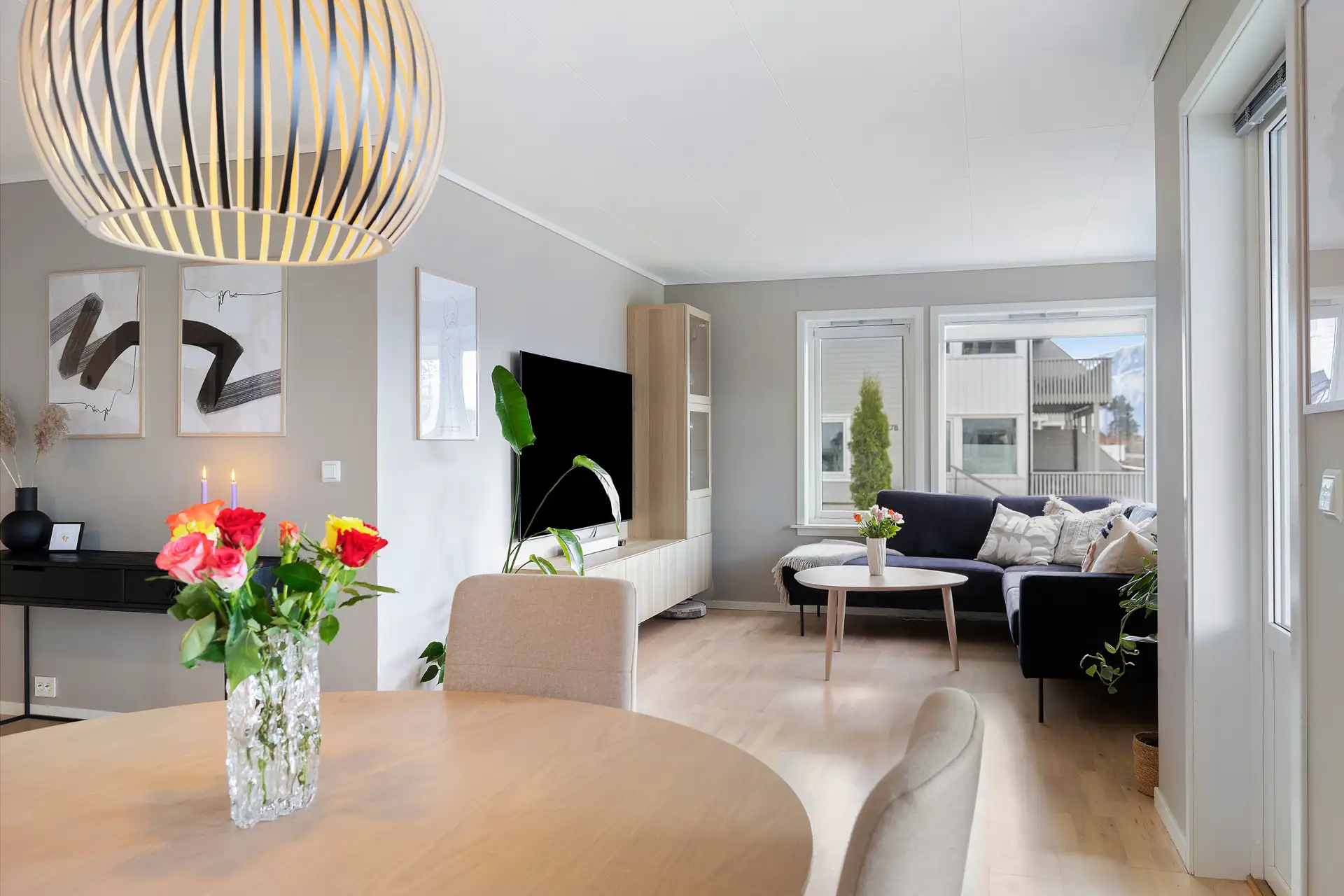Leiligheten ligger i en firemannsbolig fra 2011, som er forholdsvis ny. Den korsdelte firemannsboligen er underbygd med kjeller. Den er oppført med grunnmur av betong og støpt gulv på grunnen. Ytterveggene over grunnmuren er av bindingsverk med utvendig kledning av tre. Vinduer og verandadør med karmer av tre og isolerglass. Ytterdøren har karmer av tre og malt dørblad med vindusfelt. Det er en tett malt dør mot den utvendige boden (fra 2025). Det er en leddport av lakkert stål mot garasjen. Over deler av garasje og boder er det terrasse. Denne har gulv av terrassebord over dekke av stedstøpt betong, rekkverk og levegg av tre. Tak som valmtak tekket med betongstein.
