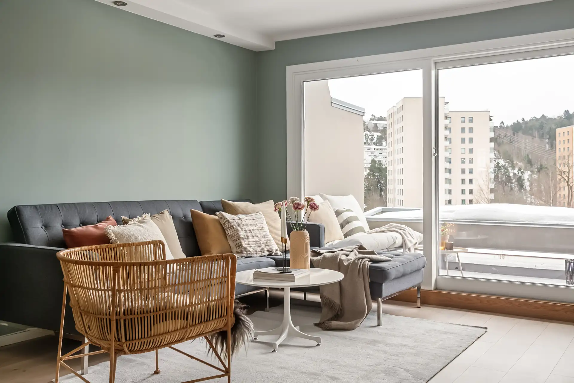 Videre inn åpner boligen seg opp i en stor og lys stue med god takhøyde på ca. 239 cm. Rommet har laminatgulv og malte veggflater som gir et moderne og tidløst uttrykk. Store vindusflater slipper rikelig med dagslys inn og skaper en luftig romfølelse gjennom hele dagen. Stuen har god plass til både sofagruppe og øvrige møbler, og rommets utforming gir fleksibilitet til ulike møbleringsløsninger, enten man ønsker en sosial sone eller flere definerte oppholdsplasser.