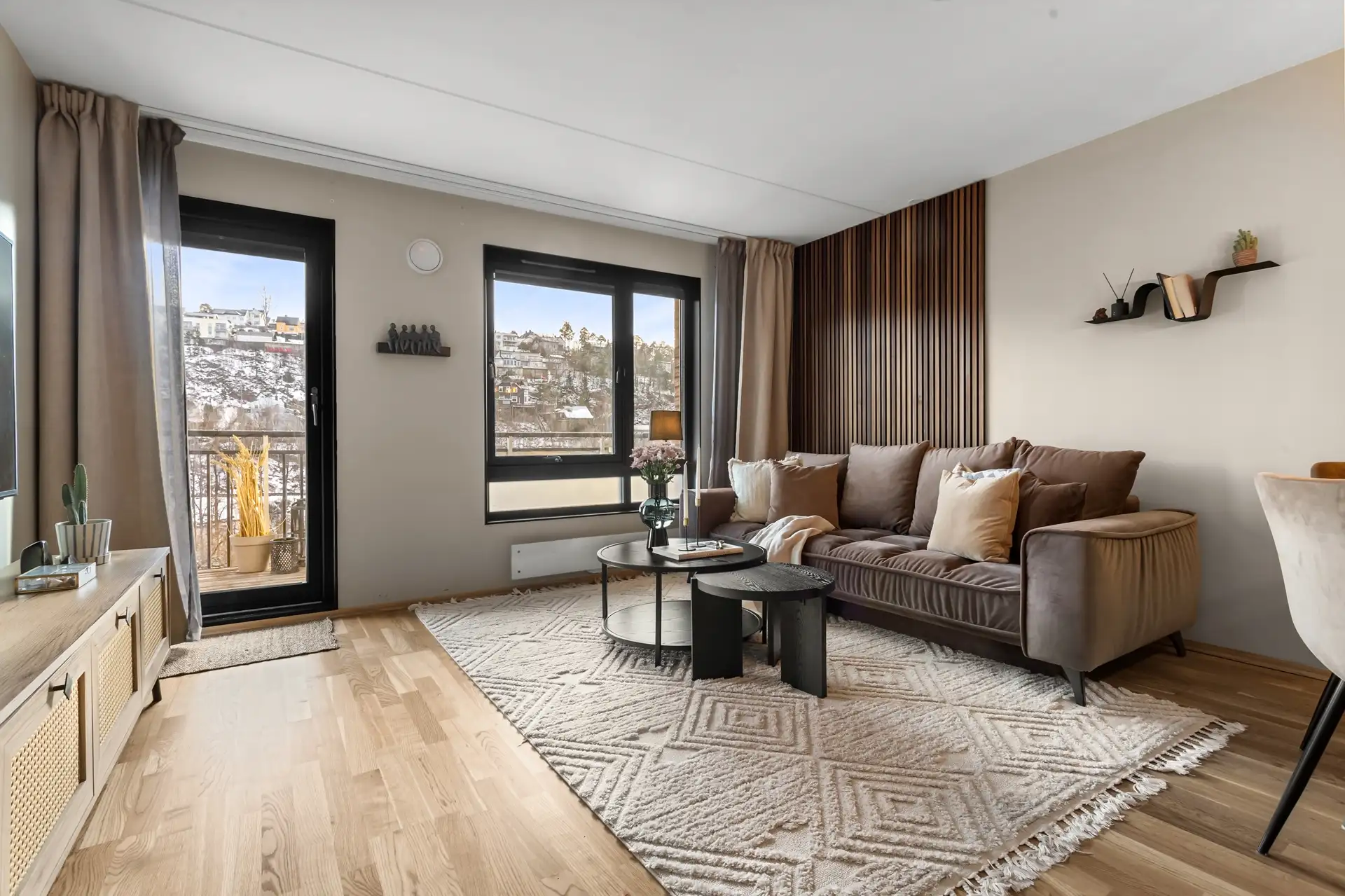 Stue og kjøkken ligger i en åpen løsning som gir en luftig og moderne romfølelse. Store vindusflater slipper dagslyset godt inn og skaper en lett og behagelig stemning gjennom hele oppholdsrommet. Stuesonen gir god plass til sofagruppe og mediemøbel, samtidig som rommet oppleves innbydende og enkelt å møblere i flere soner. Spiseplassen finner sin naturlige plass mellom kjøkken og stue, og blir et hyggelig samlingspunkt enten du dekker til hverdagsmiddag eller inviterer venner. Fra stuen er det utgang til balkong, noe som forsterker følelsen av ekstra plass og gir en fin overgang mellom inne og ute.