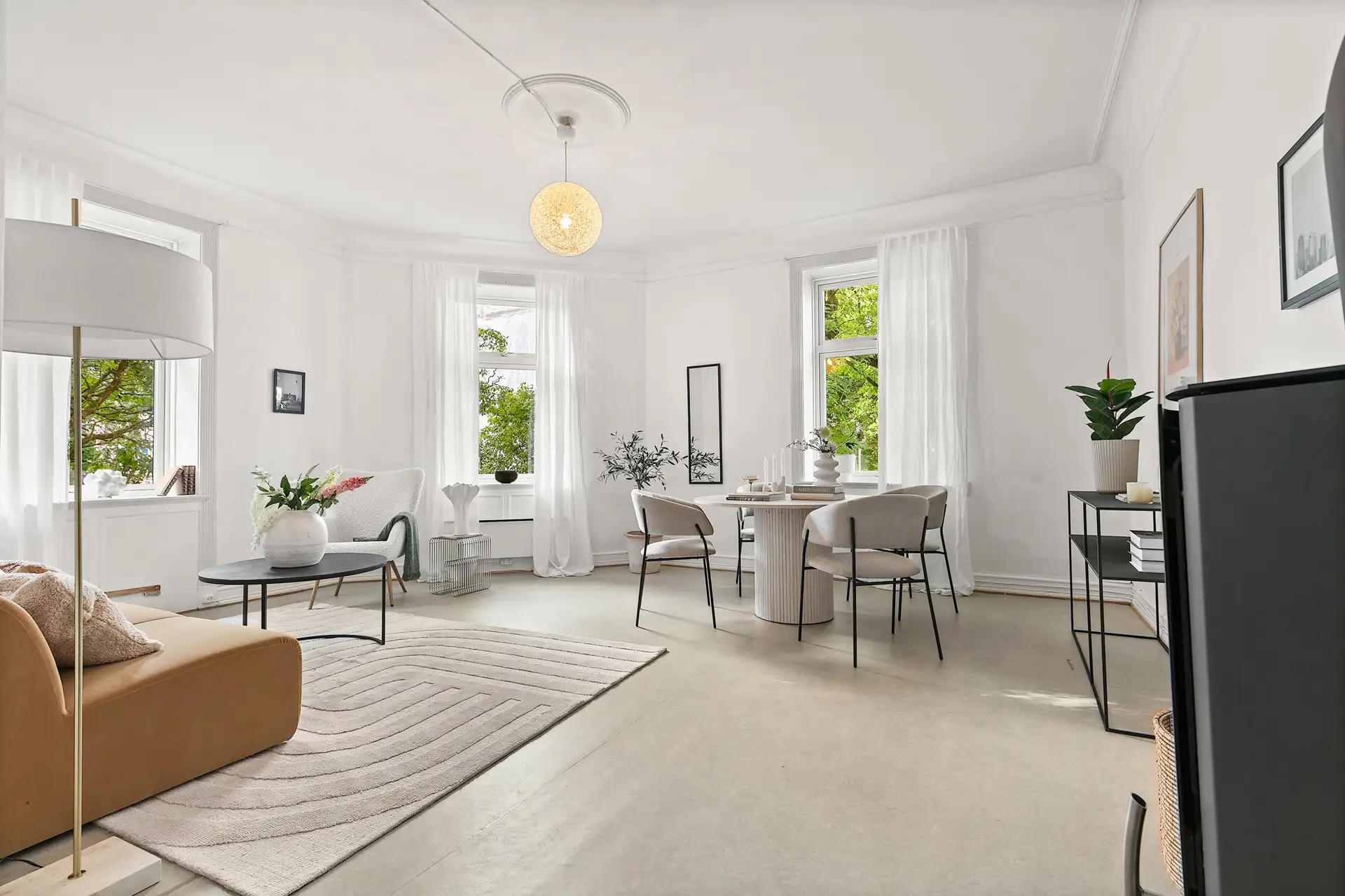 boligen. Bevarte detaljer som rosett og stukkatur gir stuen karakter, mens de lyse veggene og tregulvene