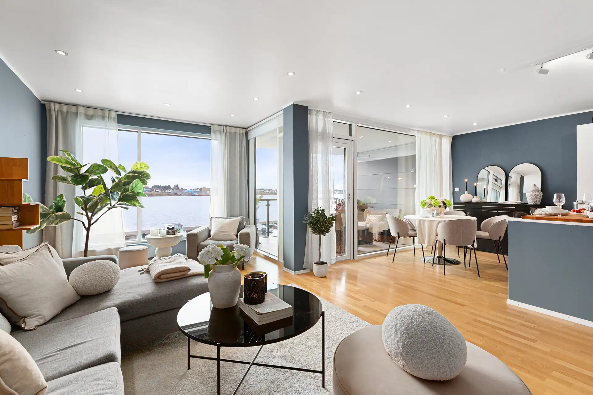 Romslig stue med store vinduer som gir godt naturlig lys inn i leiligheten. Her kan en nyte den maritime utsikten. Det er utgang til em stor fliselagt terrasse med overbygg og glassrekkverk.