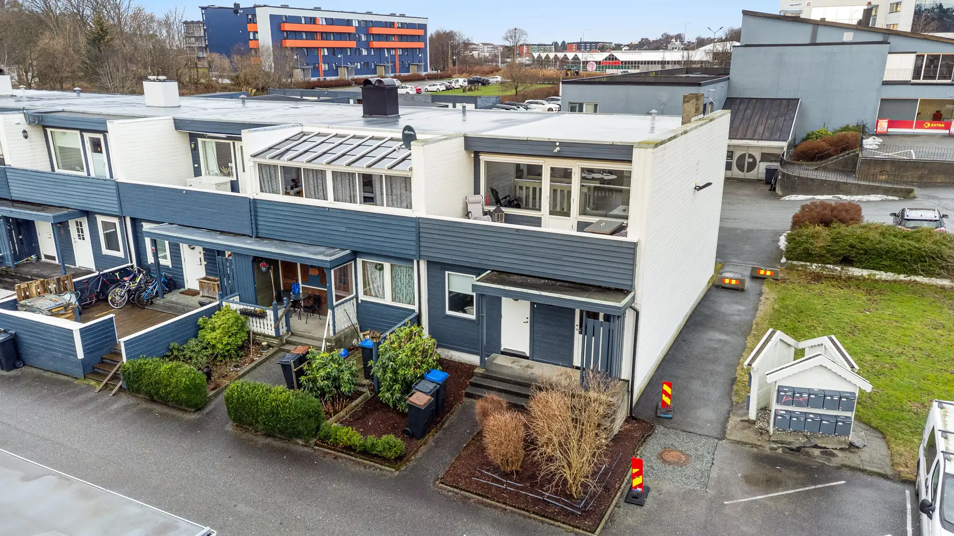 varmepumpe i trappoppgang. Fra stuen er det utgang til en terrasse, hvor en kan nyte fine dager.