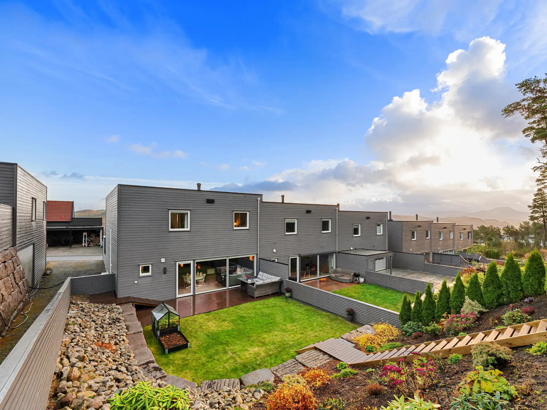 Eiendommen er etablert i skrått terreng, med hage og terrasse på boligens bakside samt asfaltert