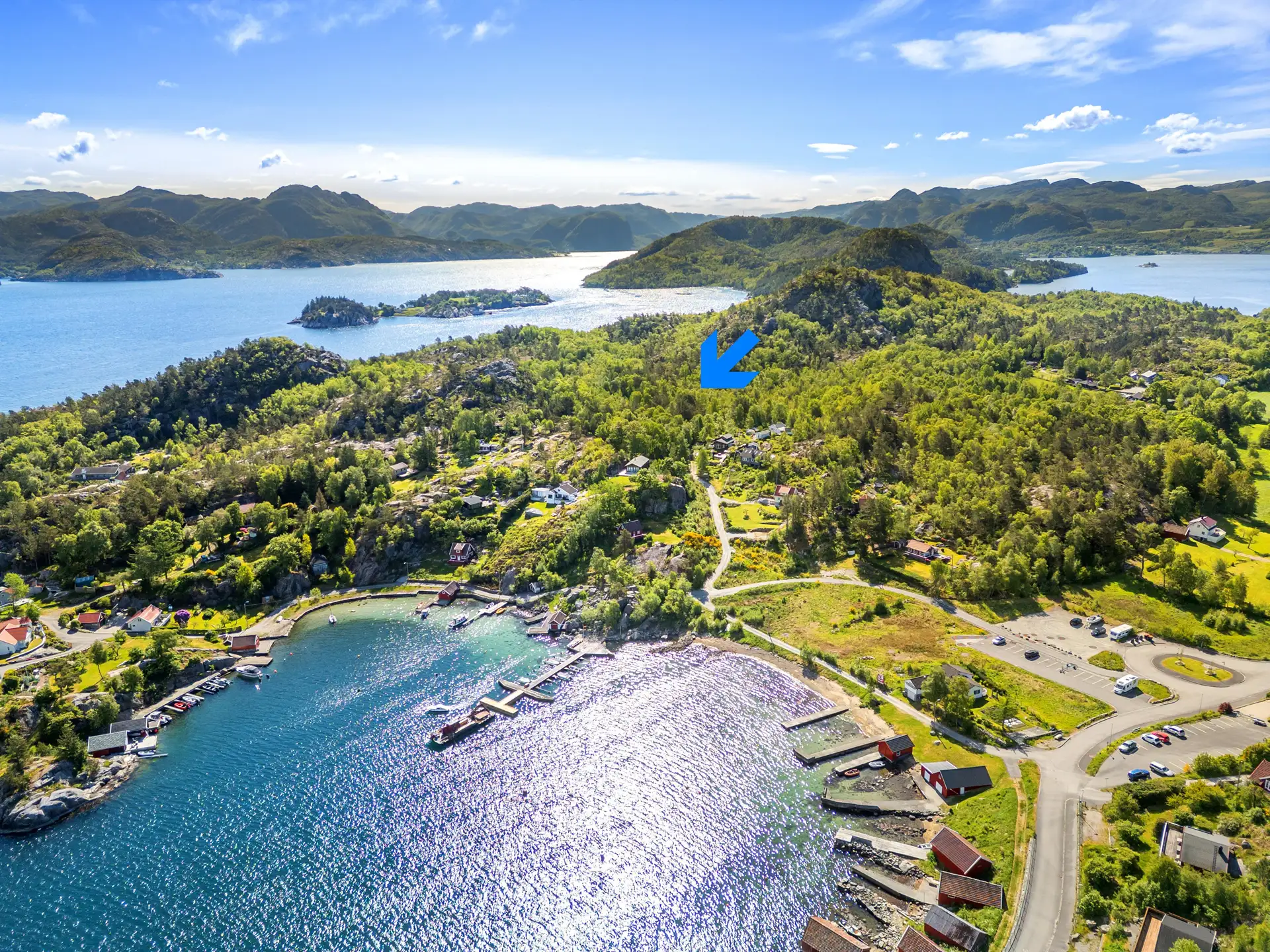 Bersagel | Hyttetomt med fjordutsikt i nydelige omgivelser | Båtplass | Vann, avløp og veg