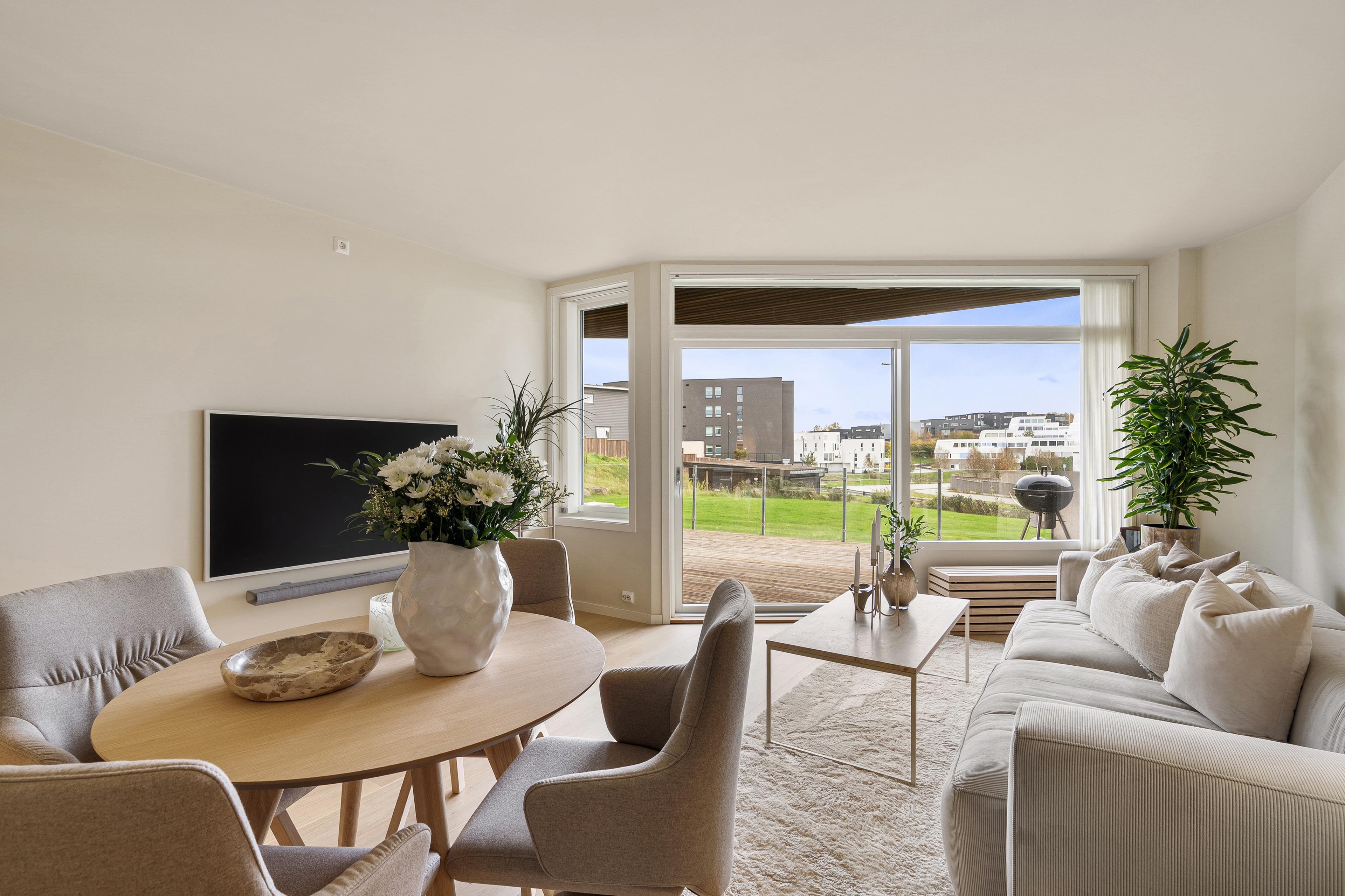 - I stuen kan det innredes med både sittegruppe og tv-seksjon. De store vinduflatene sørger for rikelig