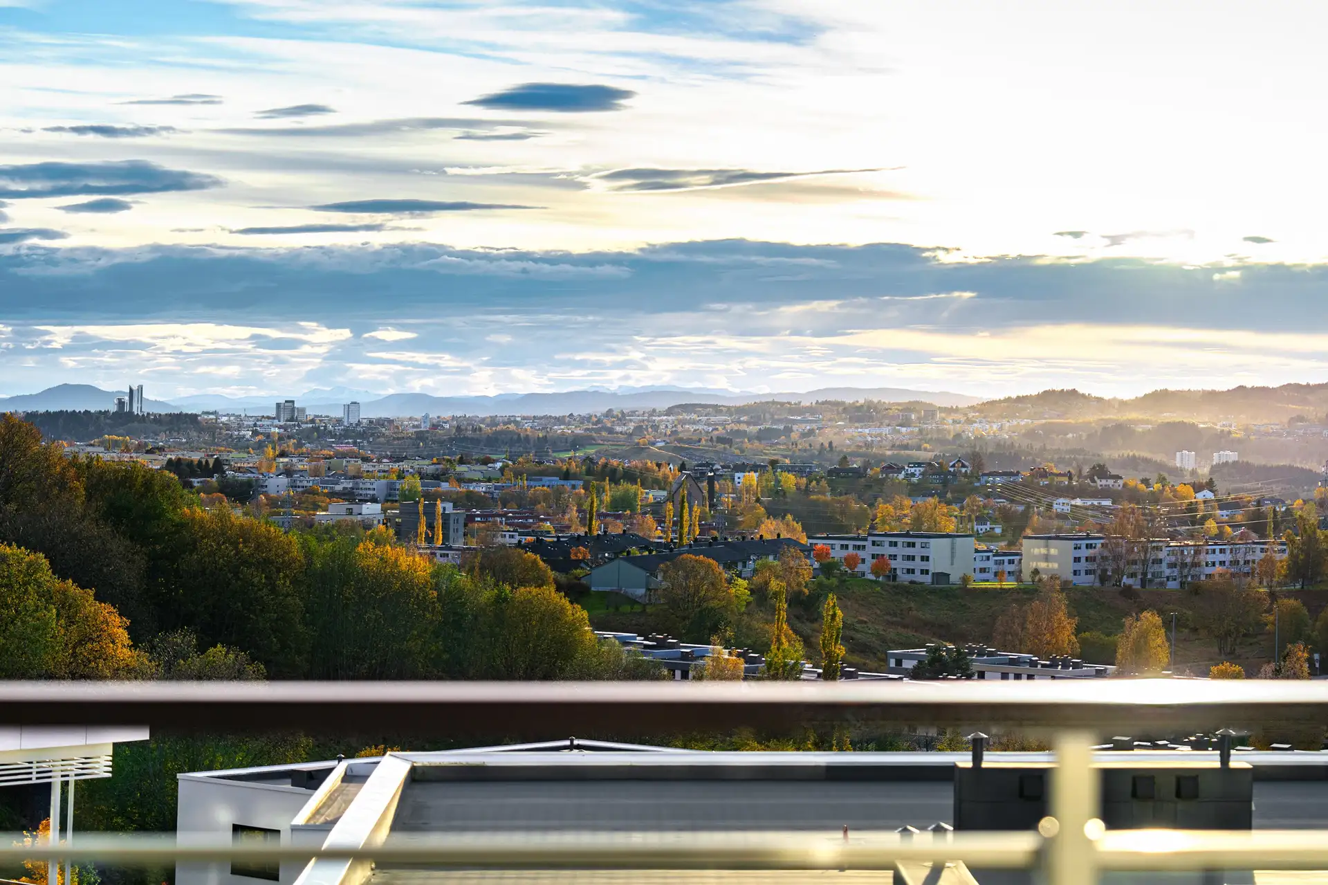 Utsikten fra leiligheten strekker seg vidt over byens tak til marka, fjell og Gråkallen. ( 20 av )