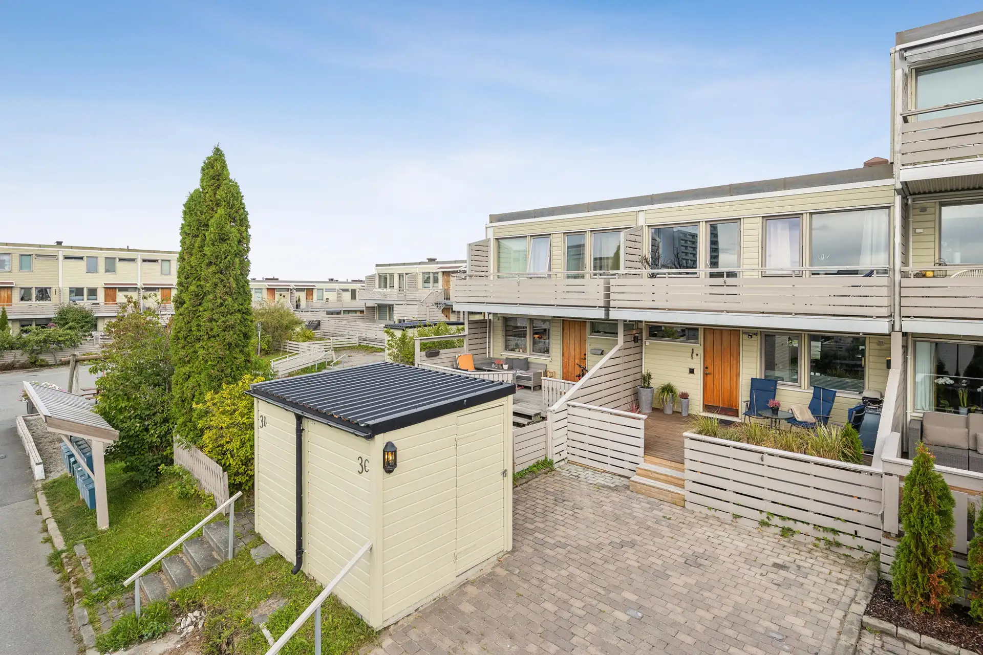 Familievennlig rekkehus med kjeller. Nytt kjøkken, bad og vaskerom i 2024. Solrike uteplasser. Rikelig med lagringsplass