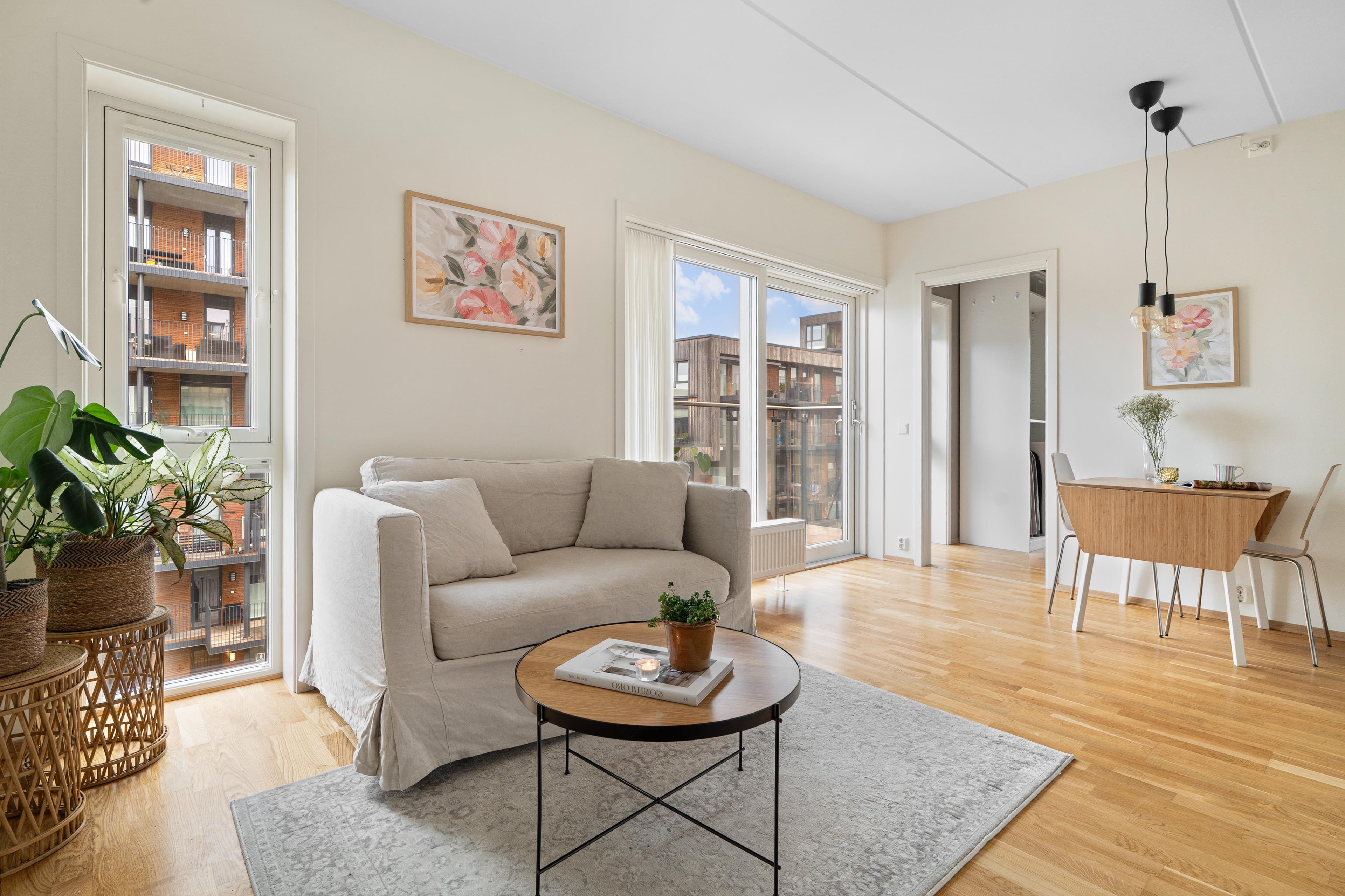 Lys og innbydende 3-roms i rolig og barnevennlig borettslag. To terrasser med gode solforhold. P-plass i kjeller.