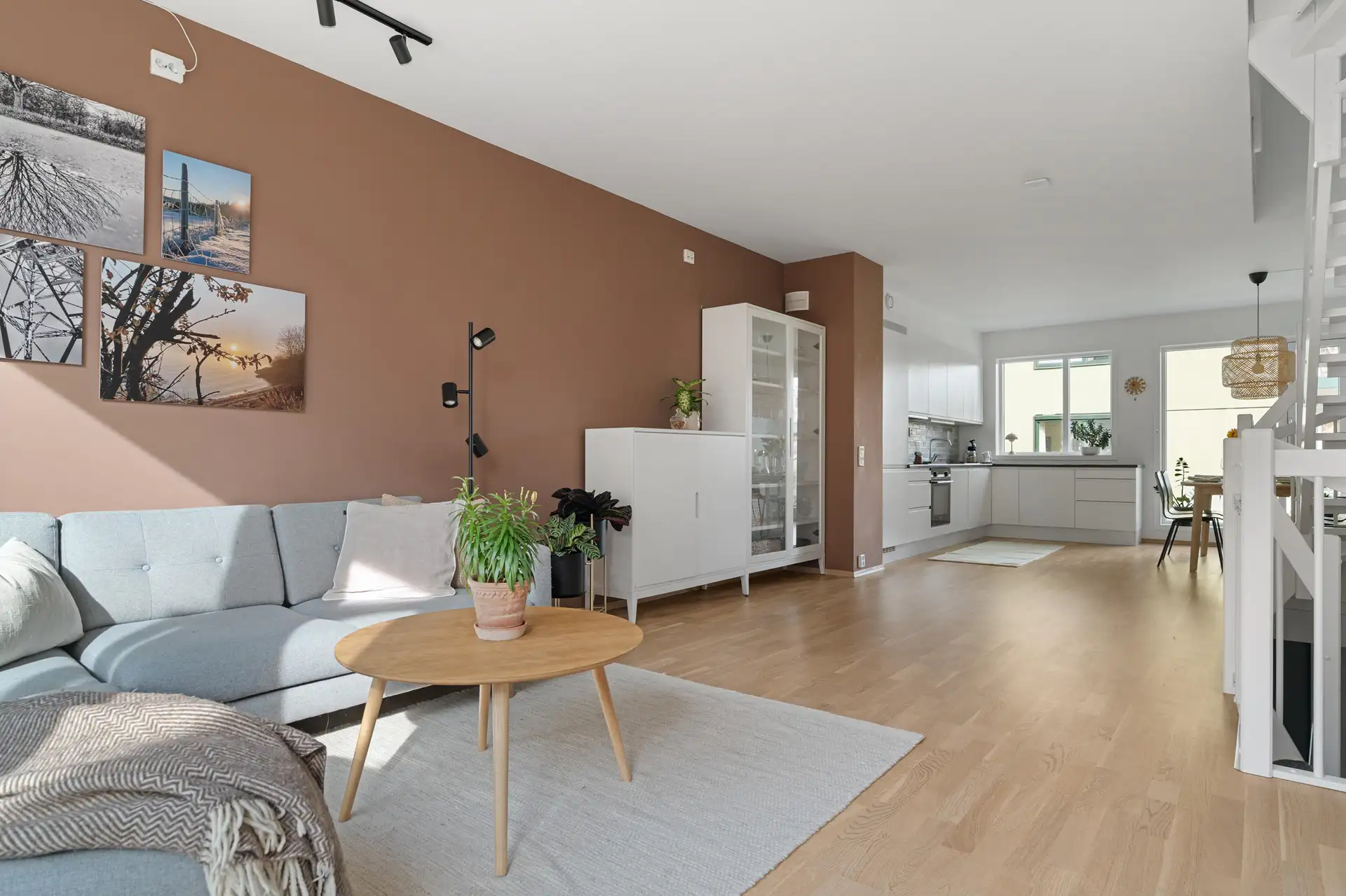 Fra gangen leder trappeløpet opp til boligens 2. etasje. Her venter et stort og flott oppholdsrom, naturlig