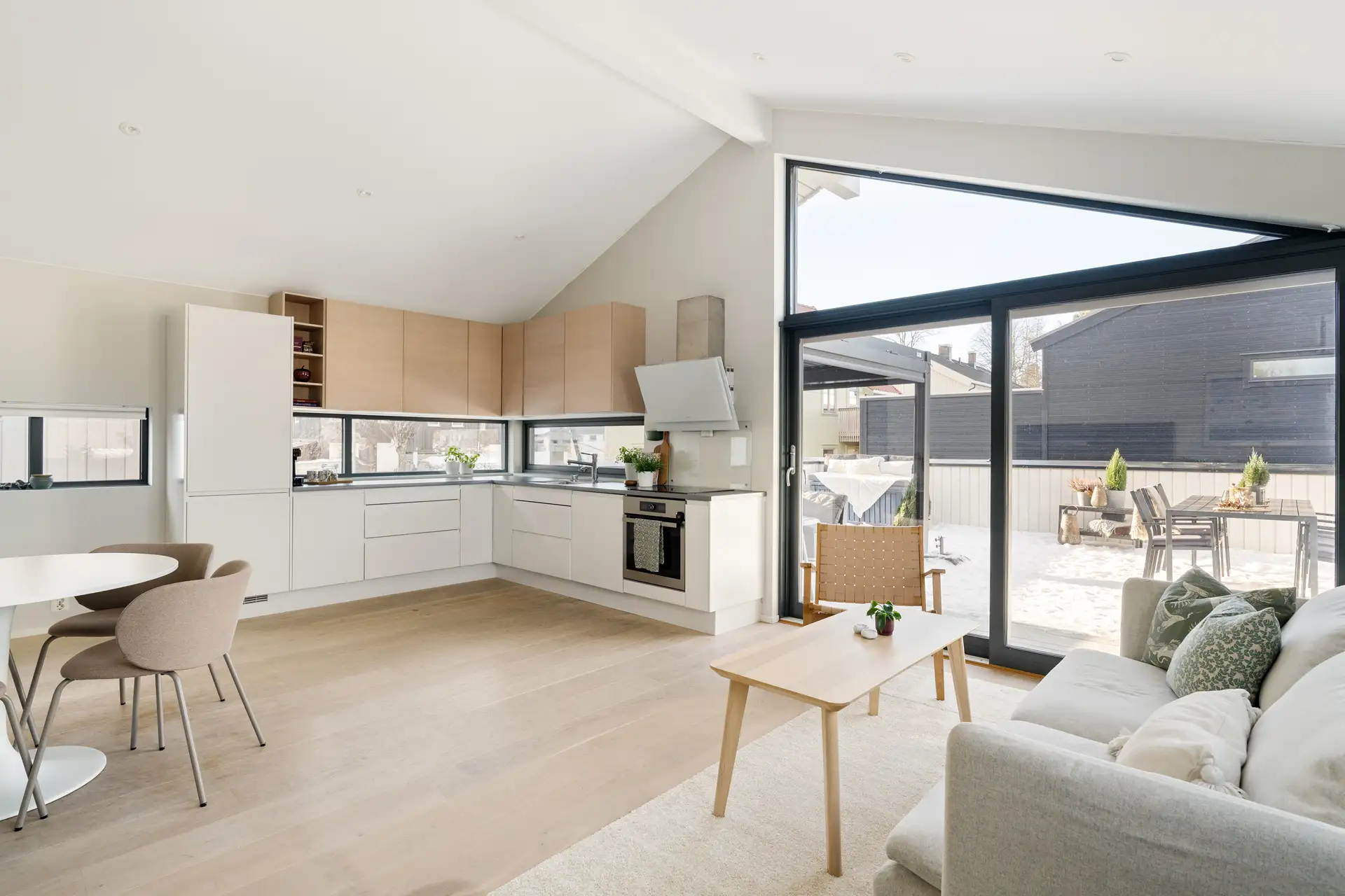 Stilren kjøkkeninnredning fra Sigdal med bl.a. stekeovn med pyrolysefunksjon, induksjonstopp, lavdesibel oppvaskmaskin, og et lavenergi kjøleskap. Alt er gjennomtenkt ned til minste detalj for høy bokomfort! Det er satt inn vindu over kjøkkenbenken som gir godt arbeidslys til kokken. Videre er det satt inn underlimt vask som både ser penere ut og gjør renholdet enklere.