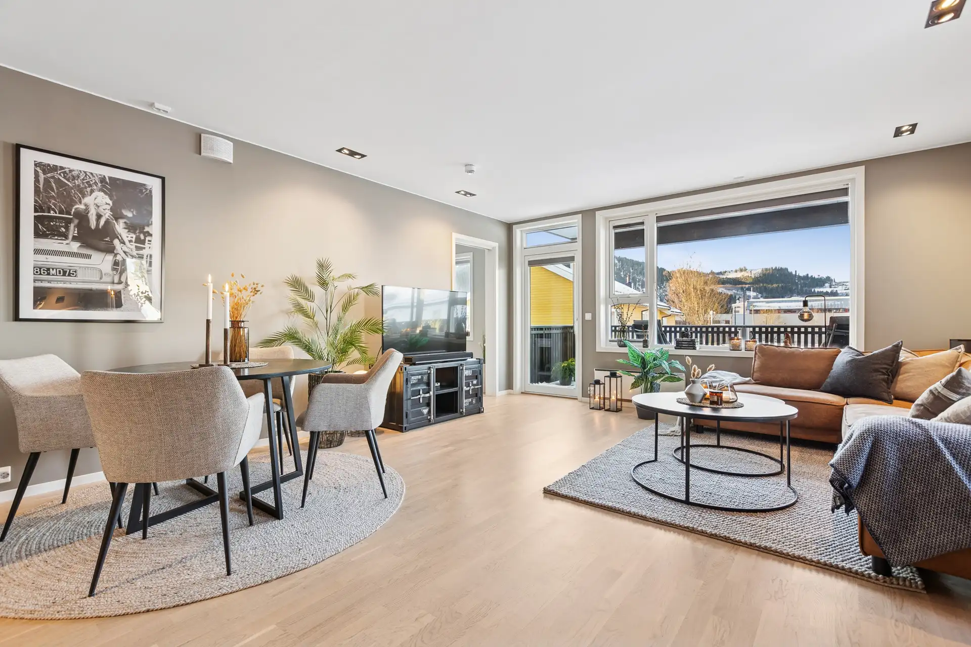 Stua er romslig og lekkert fargesatt. Downlights i taket sørger for godt med lys i rommet. ( 8 av )