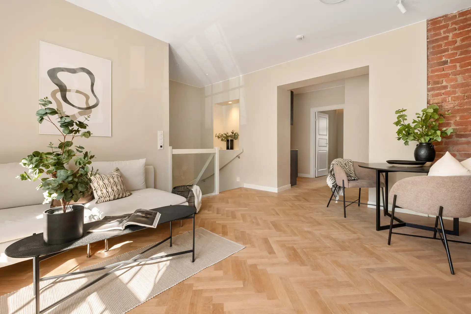 Alle rom med unntak av bad og entré er innredet med stilfull fiskebeinsparkett. ( 19 av )