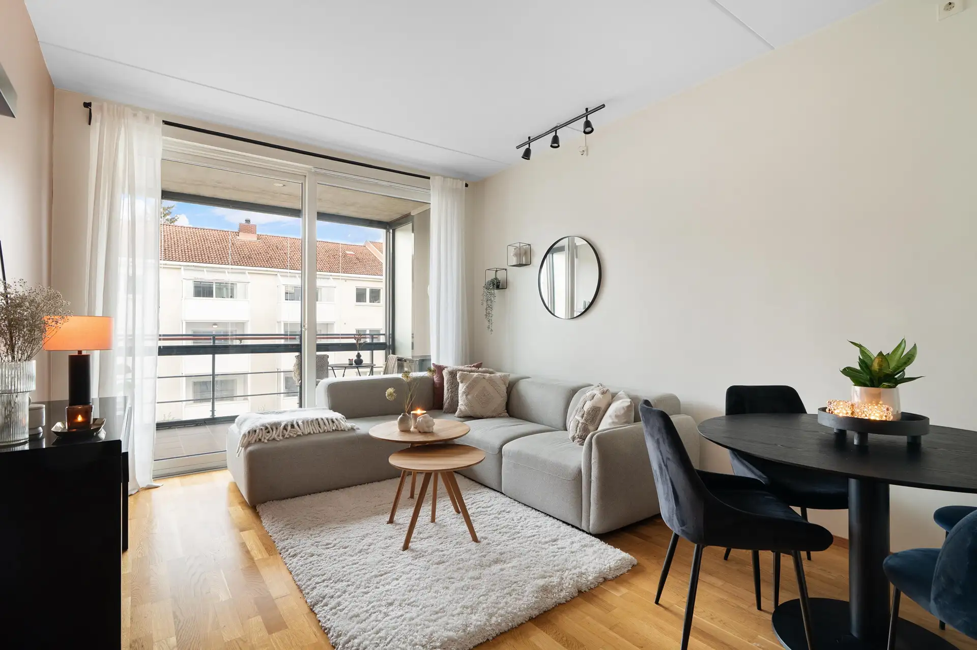 Blikket faller naturlig på leilighetens store vindusflater som strekker seg langs ytterveggen. Vinduene fyller