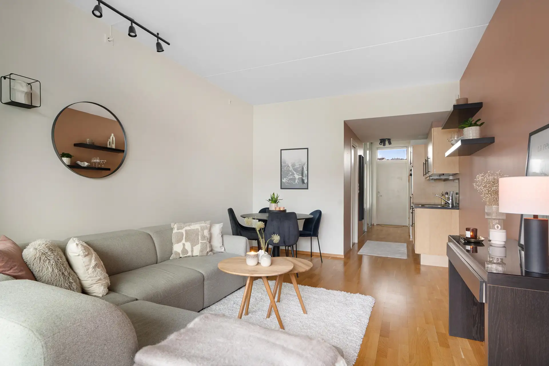 Når du åpner inngangsdøren til leiligheten, ønskes du velkommen inn i et lyst og innbydende rom,