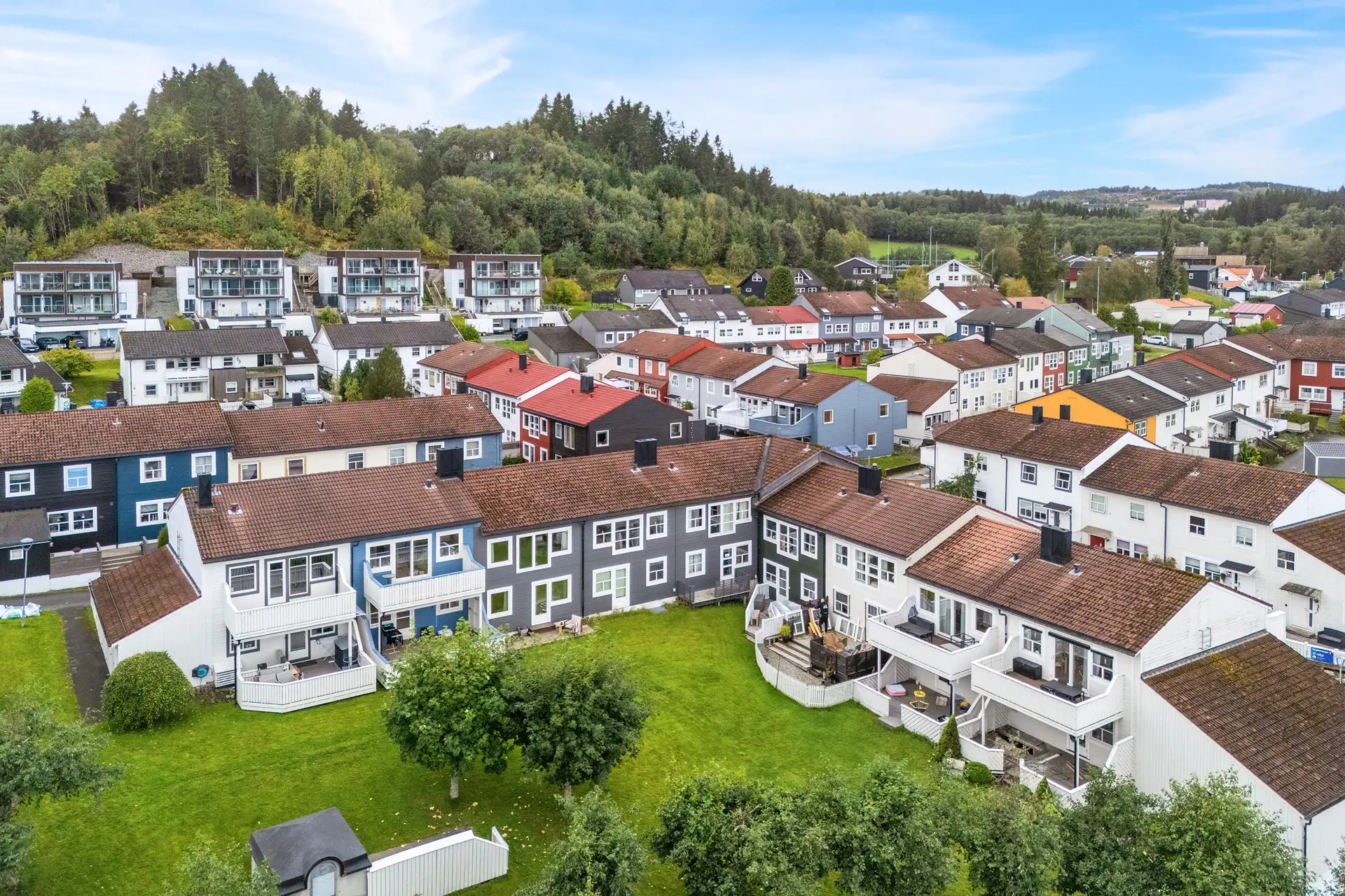 Innholdsrikt rekkehus med attraktiv beliggenhet rett ved Theisendammen og bymarka. Flott fjordutsikt. Garasje.