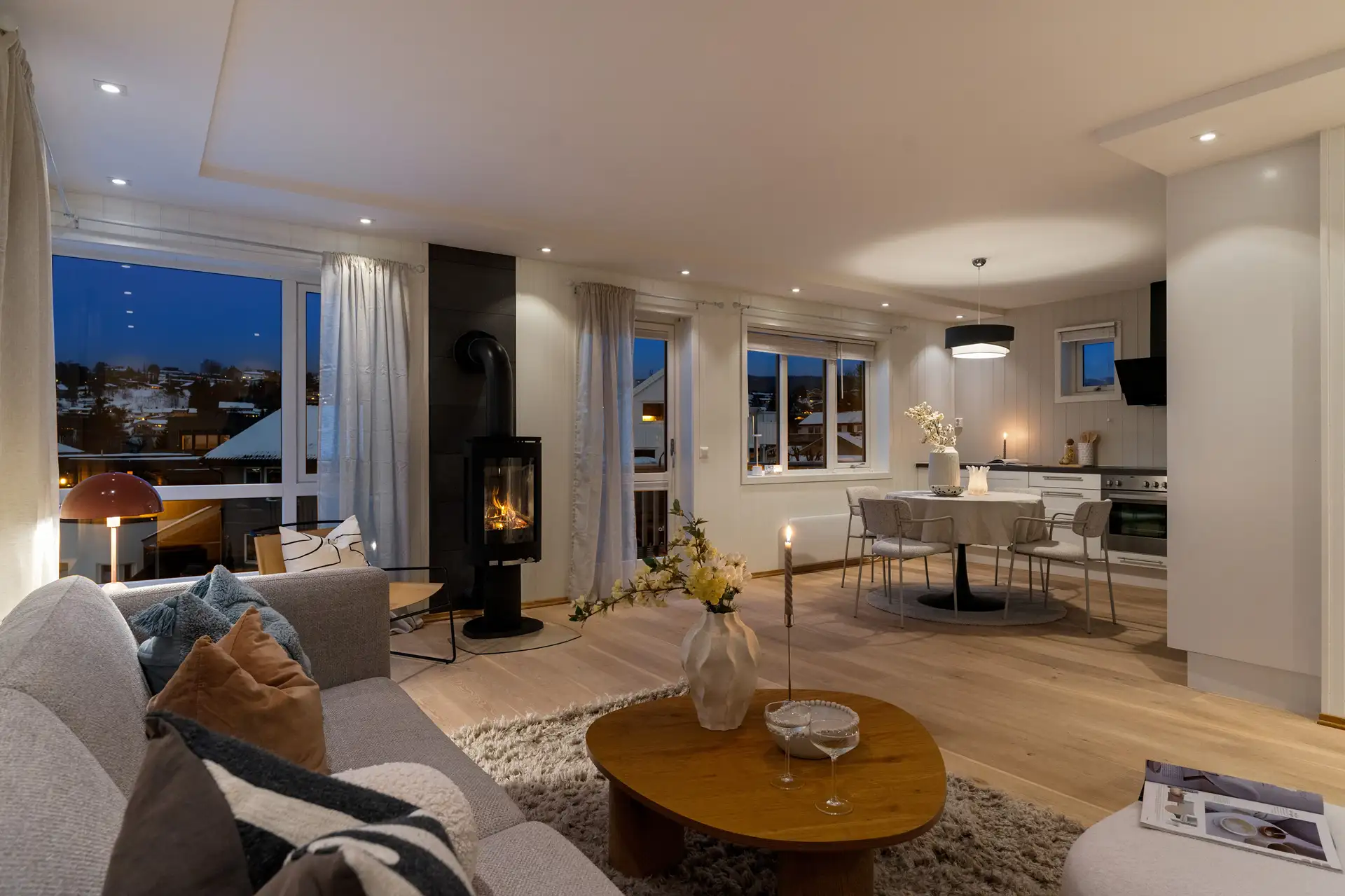 Her får man flere attraktive kvaliteter som flott utsikt, store vindusflater og et romslig oppholdsrom. ( 3 av )