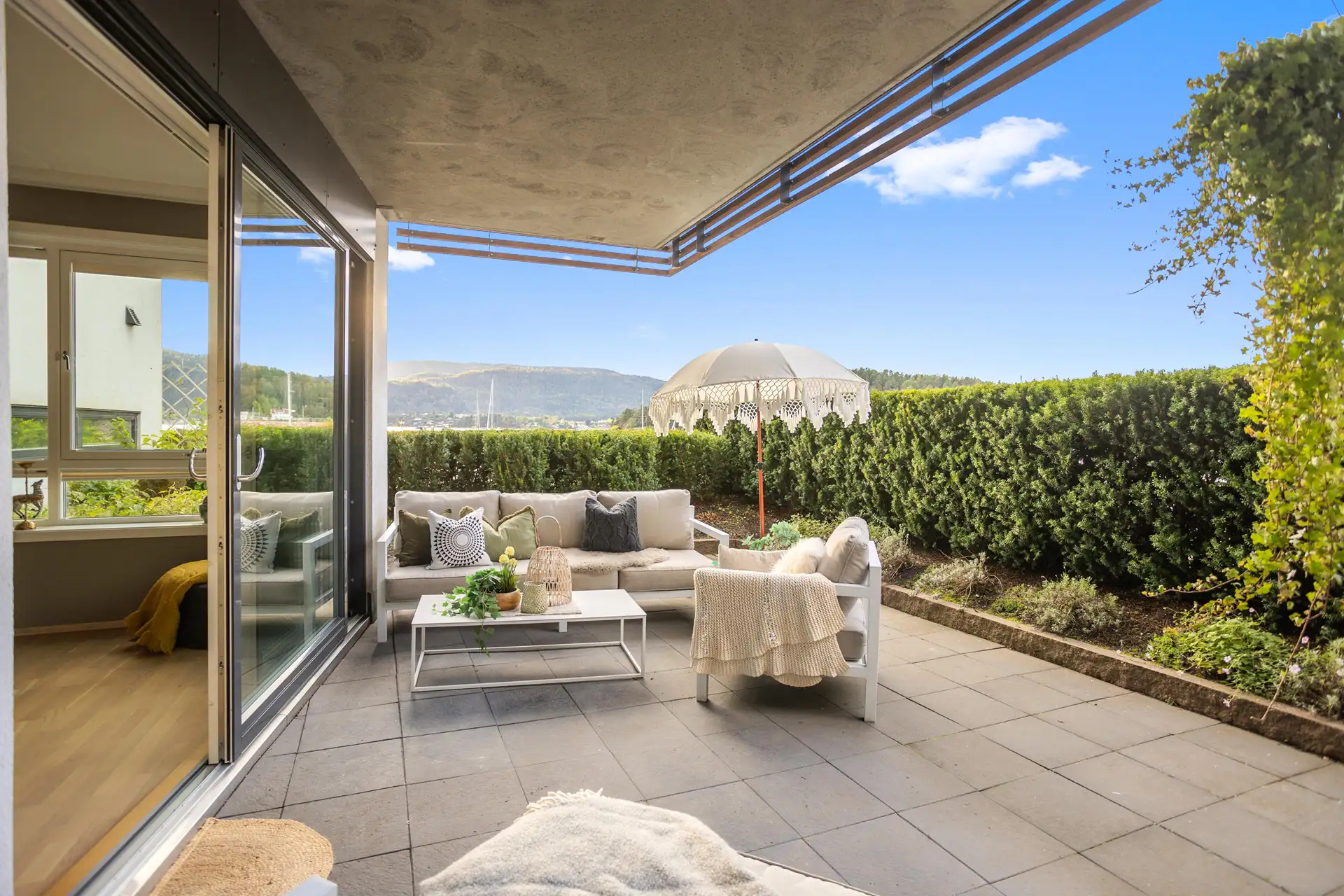 Utenfor stuen ligger et herlig uteområde på ca. 32 kvm med skjermende, tett hekk rundt. Terrassen har