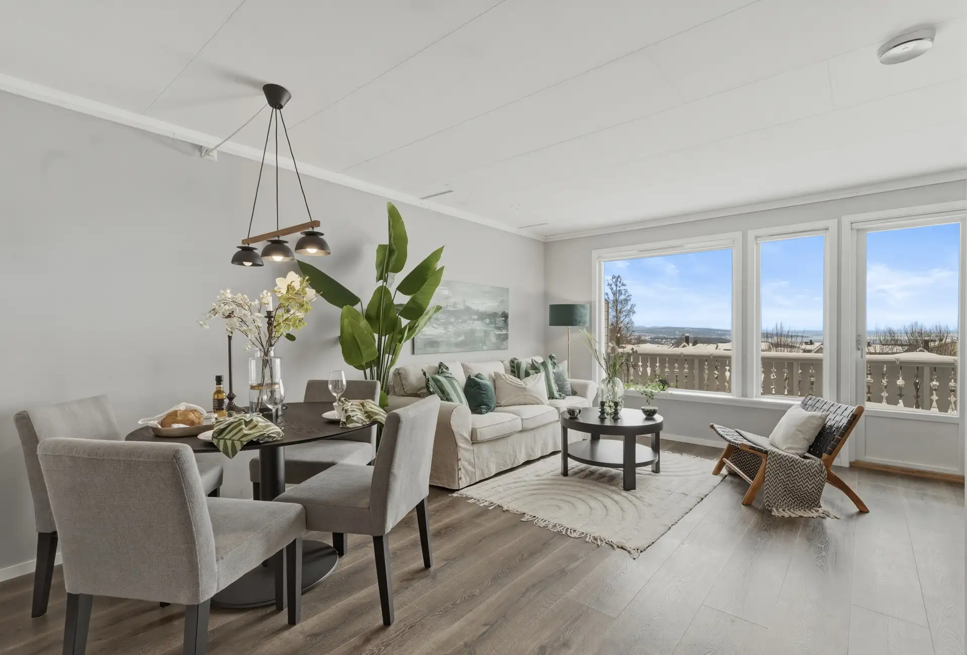 Boligen har en lys og romslig stue som enkelt kan møbleres med sofagruppe og spisebord. Stuen har store vinduer som gir fin utsikt mot fjorden, og det er utgang til veranda. Helt uten innsyn. Rommet har laminat på gulvet, takess i taket og vegger malt i lys grå farge med kontrastvegg.