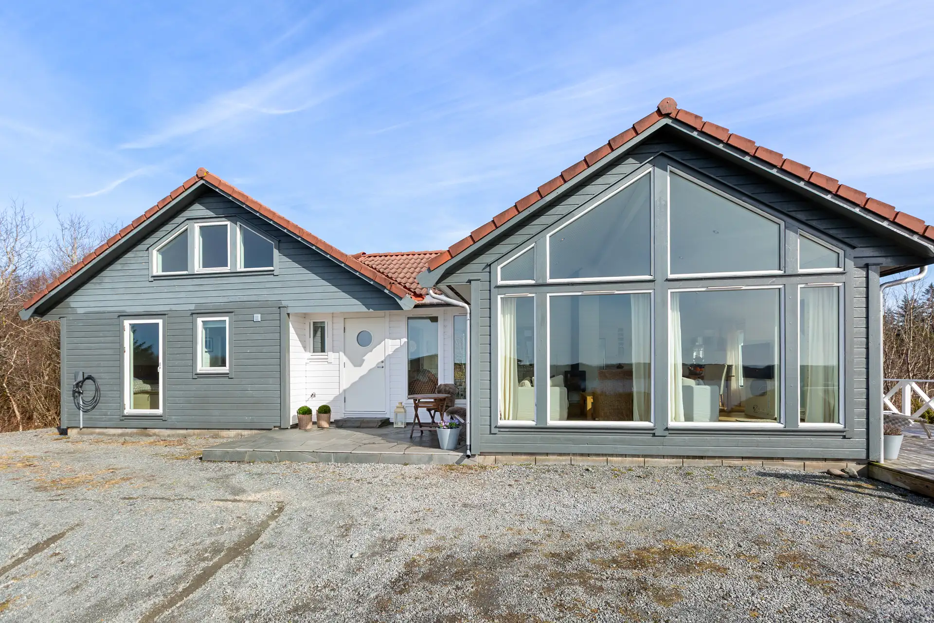 Boligen har støpt platting dekket med stein heller og terrasser med trekonstruksjon dekket med terrassebord i tre.