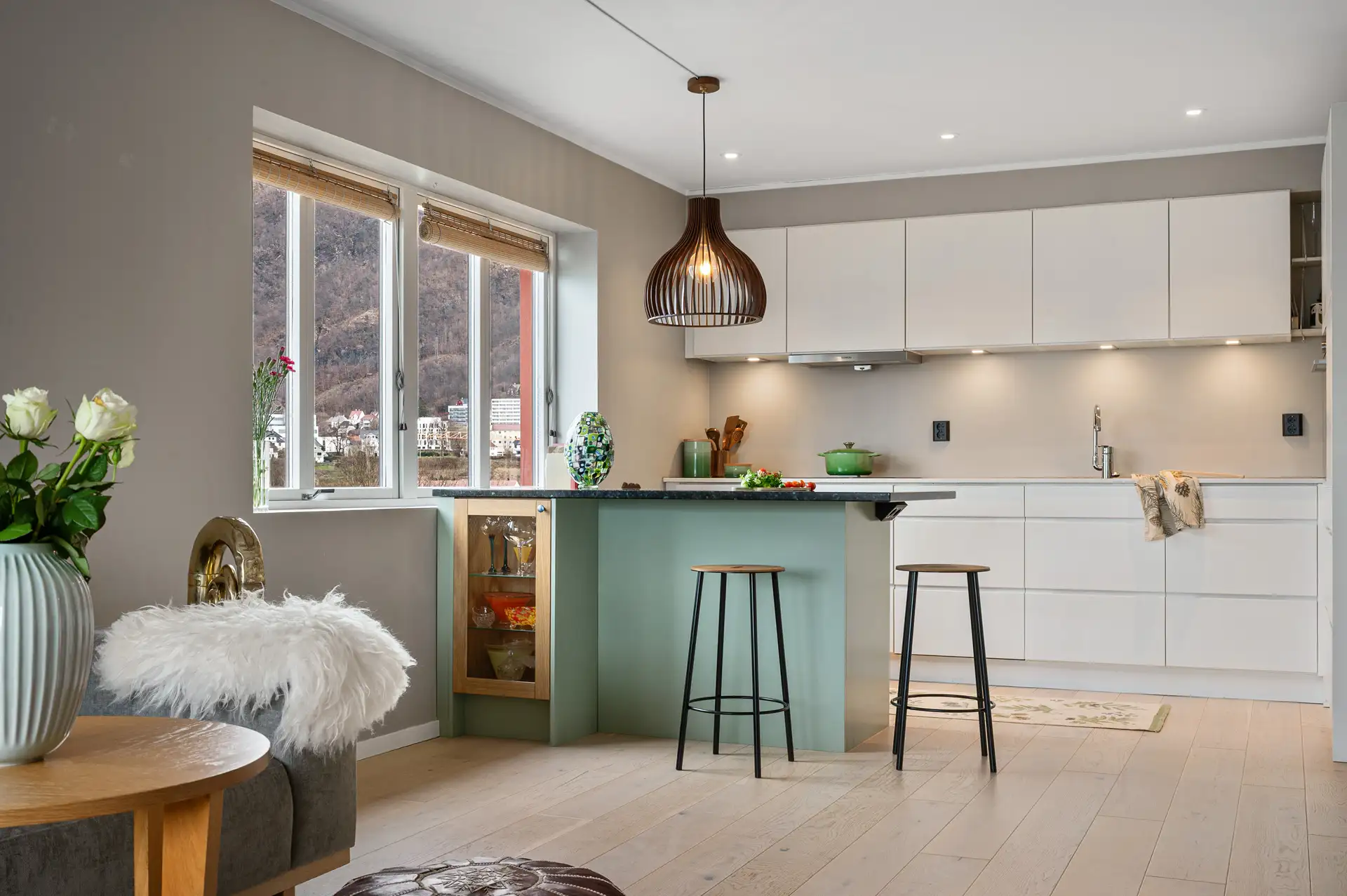 Kjøkkeninnredning fra Kvik med glatte fronter, benkeplate i stein og underlimt vask med ett-greps blandebatteri. Belysning/stikk under overskap. Kjøkkenøy med stikkontakt og USB-lader. Integrerte hvitevarer: Stekeovn fra Siemens, induksjonstopp fra Siemens, oppvaskmaskin fra Siemens og kjøleskap med frysedel fra Bosch. Integrert ventilator fra Siemens. Kjøkkenet er utstyrt med komfyrvakt og lekkasjesensor. Kjøkkeninnredning fra 2017/2018. Merk: Avstand fra gulv til benkeplate ble måltt til 95 cm, normal monteringshøyde er 90 cm.