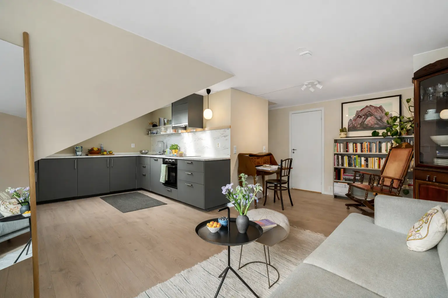 Innvendig har leiligheten laminat på gulv og malte flater på vegger og i himlinger i entré, trapperom, gang, sovealkove og stue/kjøkken. Badet har keramiske fliser på gulv og vegger, med malte flater i himling. Badet inneholder baderomsmøbel med slette fronter, heldekkende servant og ettgreps blandebatteri, speil med belysning, veggskap, vegghengt toalett og dusj med innfellbar dør i herdet glass, samt elvarmekabler, plastsluk og avtrekksventil i himling. Badet er opplyst å være fra 2012, men det foreligger ikke dokumentasjon. Kjøkkeninnredningen er fra IKEA med glatte fronter, laminat benkeplate, nedfelt stålvask og kitchenboard over benkeplate. Kjøkkenet er fra 2022 og er utstyrt med integrert stekeovn, induksjonstopp, oppvaskmaskin, kjøleskap, fryseskap og integrert ventilator fra Flexit. Det er også opplegg for vaskemaskin, komfyrvakt og lekkasjesensor.
