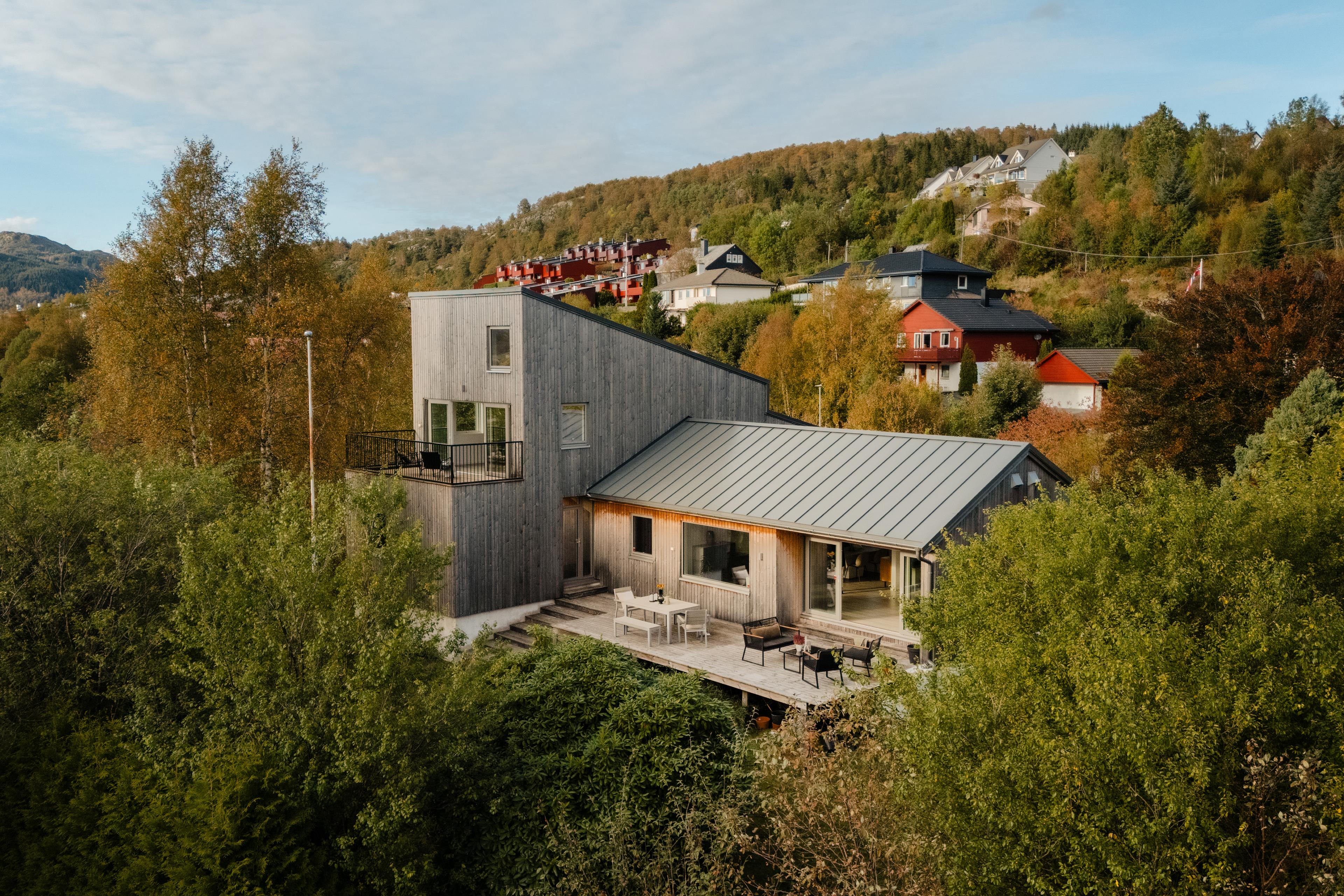 - Fasade: Fasade/kledning har stående varmebehandlet bordkledning.